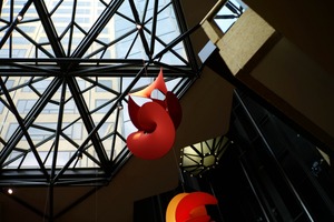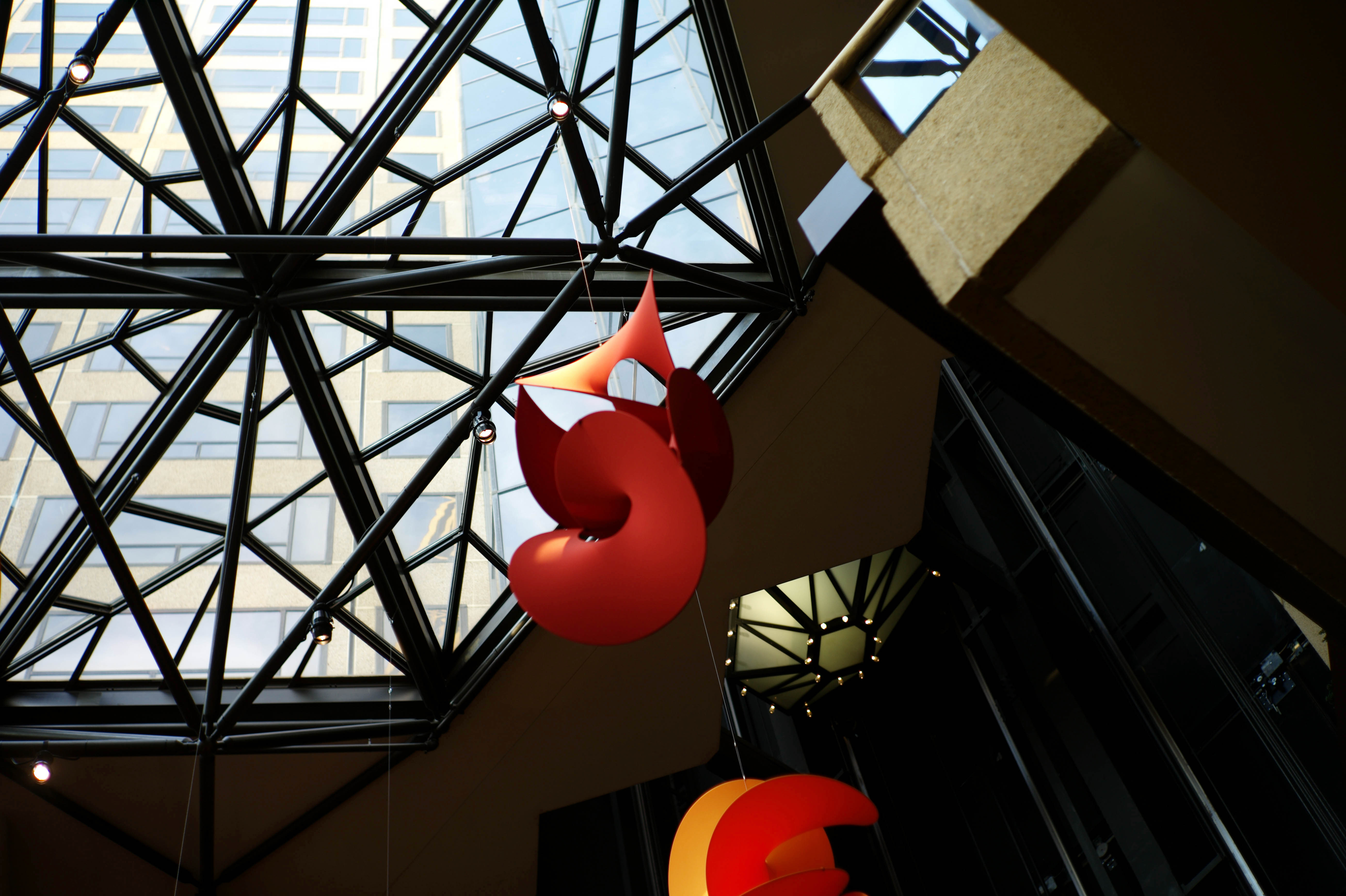 The photograph captures a striking interplay between colorful suspended sculptures and a geometric glass ceiling, creating a dynamic visual contrast. Bright reds and warm tones of the artwork stand out against the cool neutrality of the glass and metal structure, evoking a sense of playfulness and creativity. Soft, natural light filters through, enhancing the vibrant hues while casting delicate shadows that dance across the surfaces below.