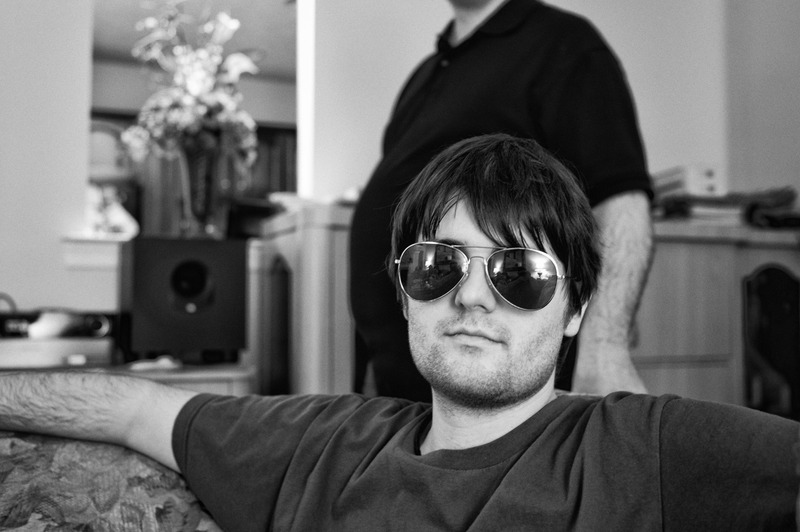 A relaxed young man lounges confidently on a couch, wearing dark sunglasses that obscure his eyes and reflect the room's muted tones. The composition is intimate, capturing a glimpse of his surroundings and the looming figure of a person behind him, adding a layer of intrigue. The black-and-white palette enhances the mood, evoking a sense of nostalgia and contemplation amidst the casual setting.
