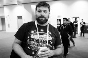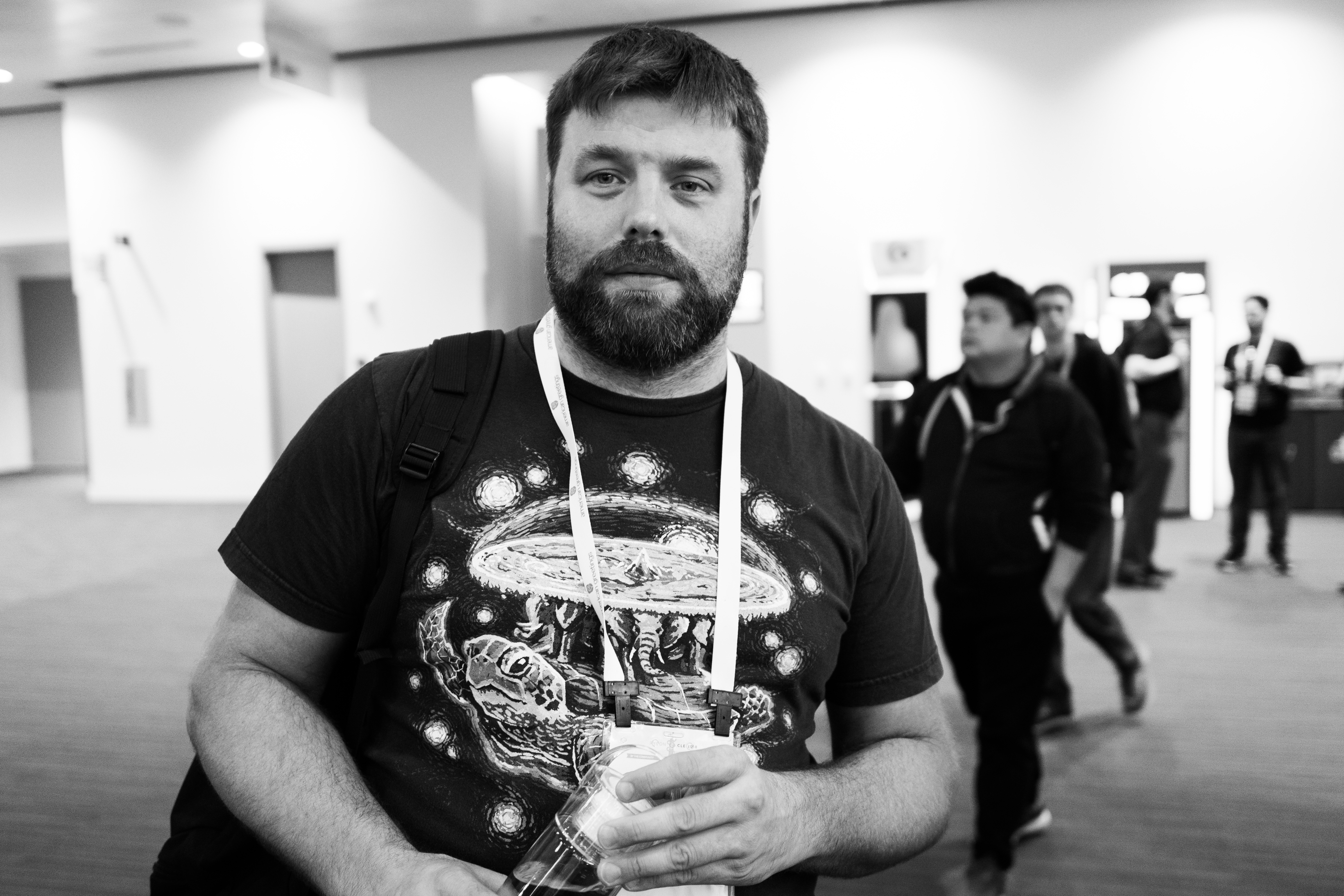 The photograph features a man with a serious expression, holding a drink, while wearing a graphic t-shirt adorned with an otherworldly design. Soft lighting highlights his face, creating a contemplative mood amidst the bustling background of people, where their blurred movements add a sense of life and energy to the scene.