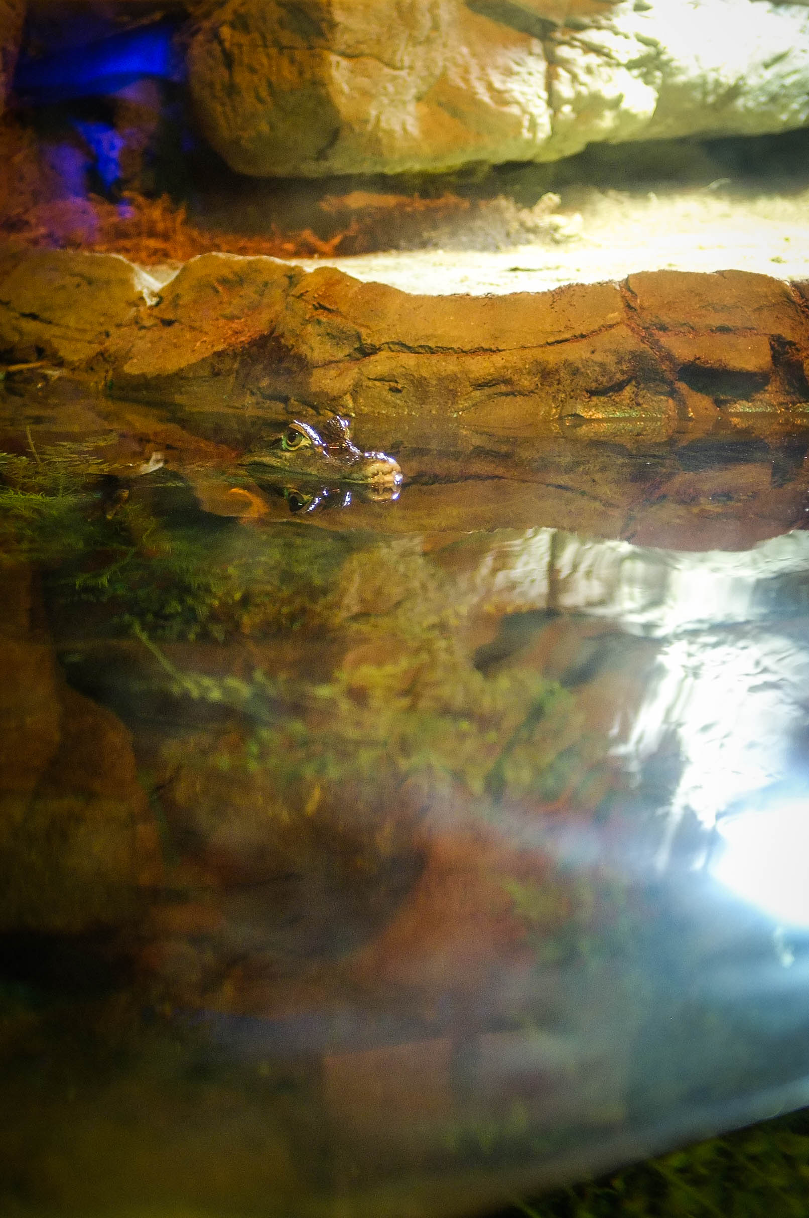 A tranquil scene showcases a frog partially submerged in crystal-clear water, its eyes peering curiously above the surface. The warm glow of ambient light casts a serene mood, illuminating the textured rocks and reflecting patterns on the water. The composition invites contemplation, blending nature's simplicity with the intricate dance of light and shadow.