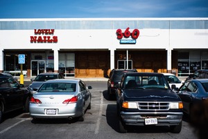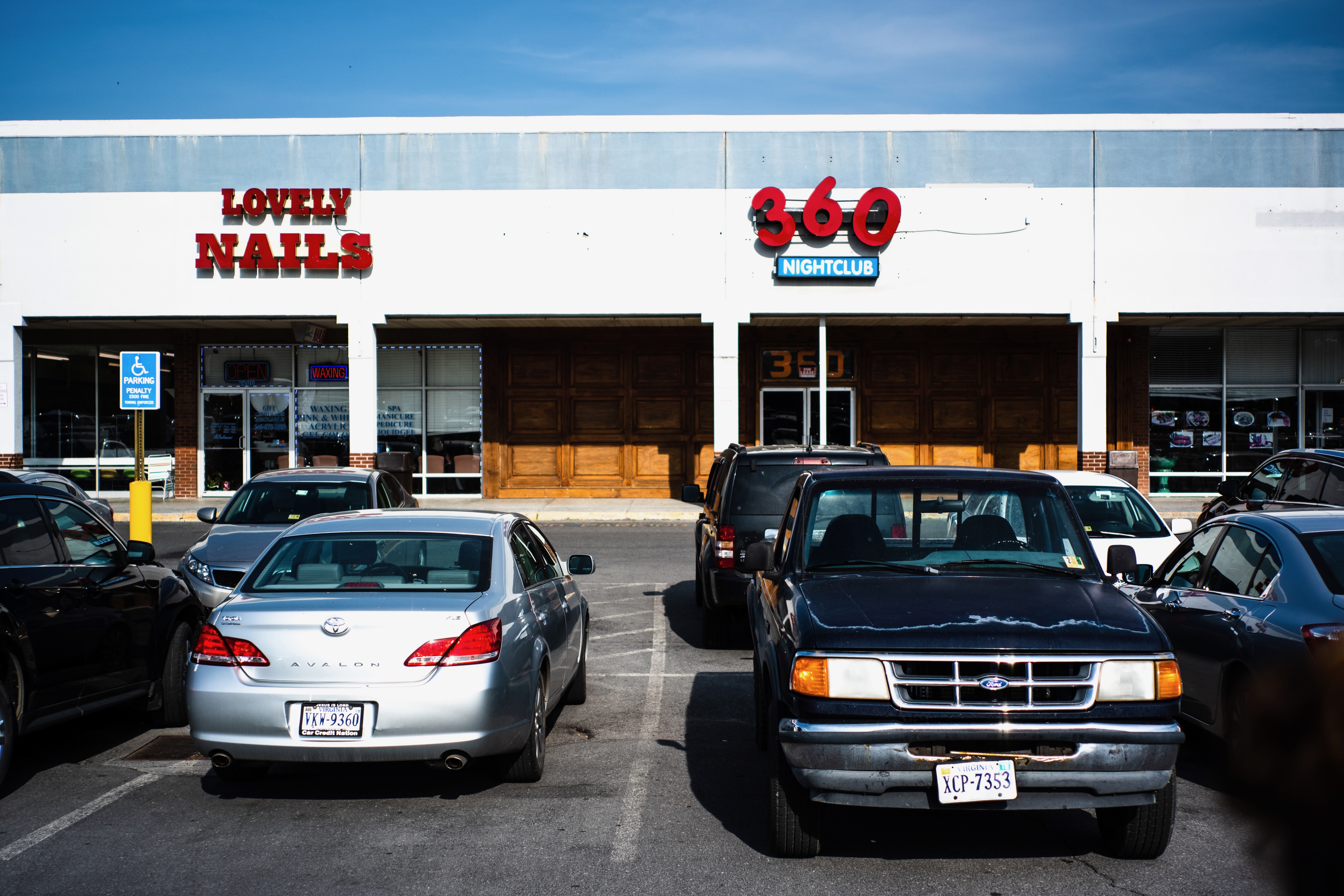 The photograph captures the facade of a strip mall, highlighting the contrasting establishments of 'Lovely Nails' and '360 Nightclub.' Bright signage contrasts with the muted colors of the parked cars, evoking a sense of mundane suburban life juxtaposed with the allure of nightlife. The composition utilizes strong natural lighting to emphasize the vibrant yet unremarkable setting, enhancing a feeling of juxtaposition between day and night activities.
