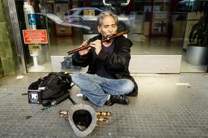 A man sits cross-legged on the pavement, passionately playing a wooden flute in front of a storefront, his expression reflecting deep concentration and joy. The warm sunlight casts soft shadows, creating a cozy yet vibrant atmosphere, while the urban backdrop adds a touch of everyday life to the scene. Surrounding him, a few objects hint at his nomadic existence, contrasting beautifully with the serene moment of musical expression.