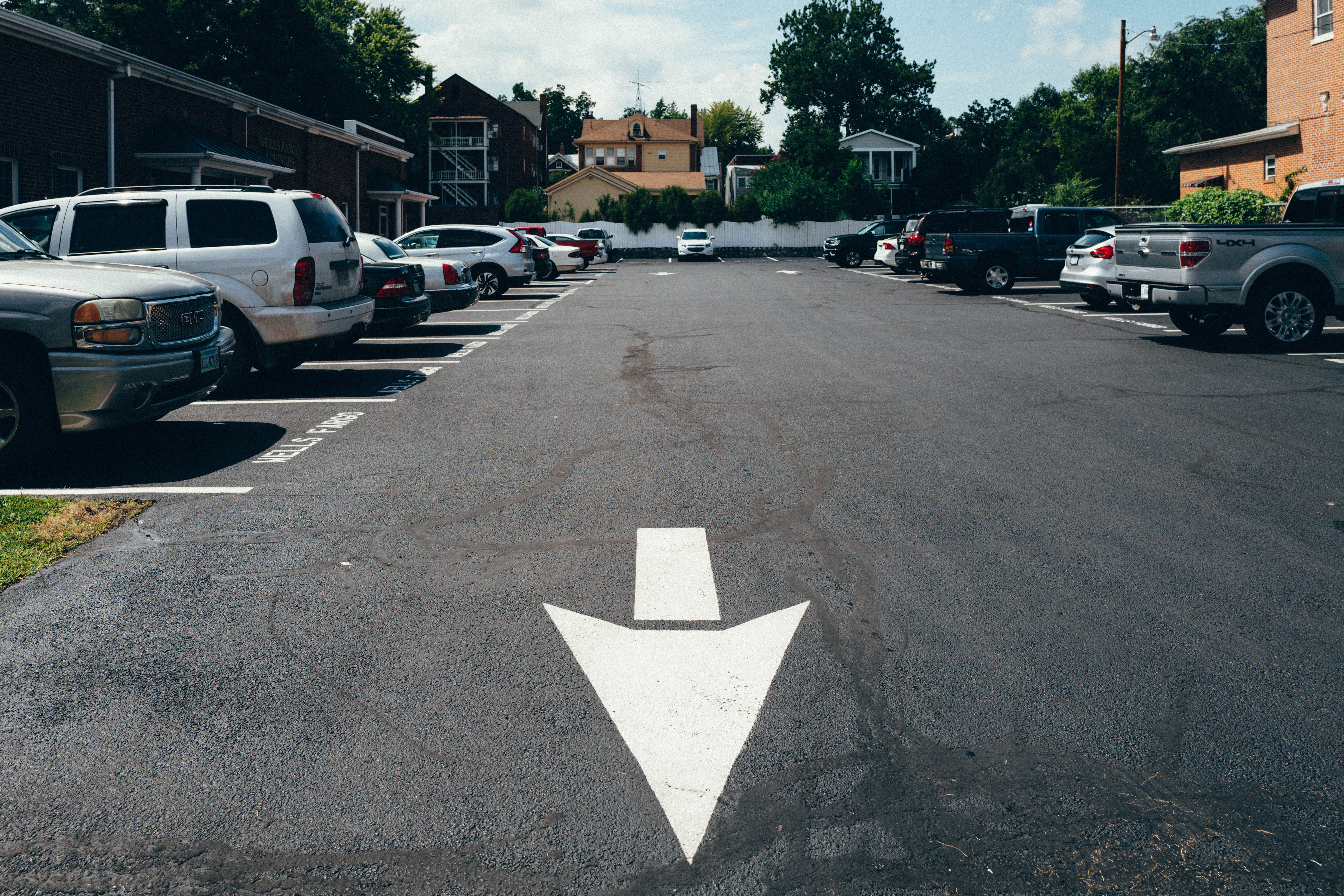 The photograph captures a serene parking lot, characterized by an orderly array of parked vehicles along both sides. A prominent white arrow on the asphalt draws the eye toward the distant buildings, creating a sense of direction and calm in the composition, while the soft, natural lighting enhances the tranquil mood of this everyday scene.