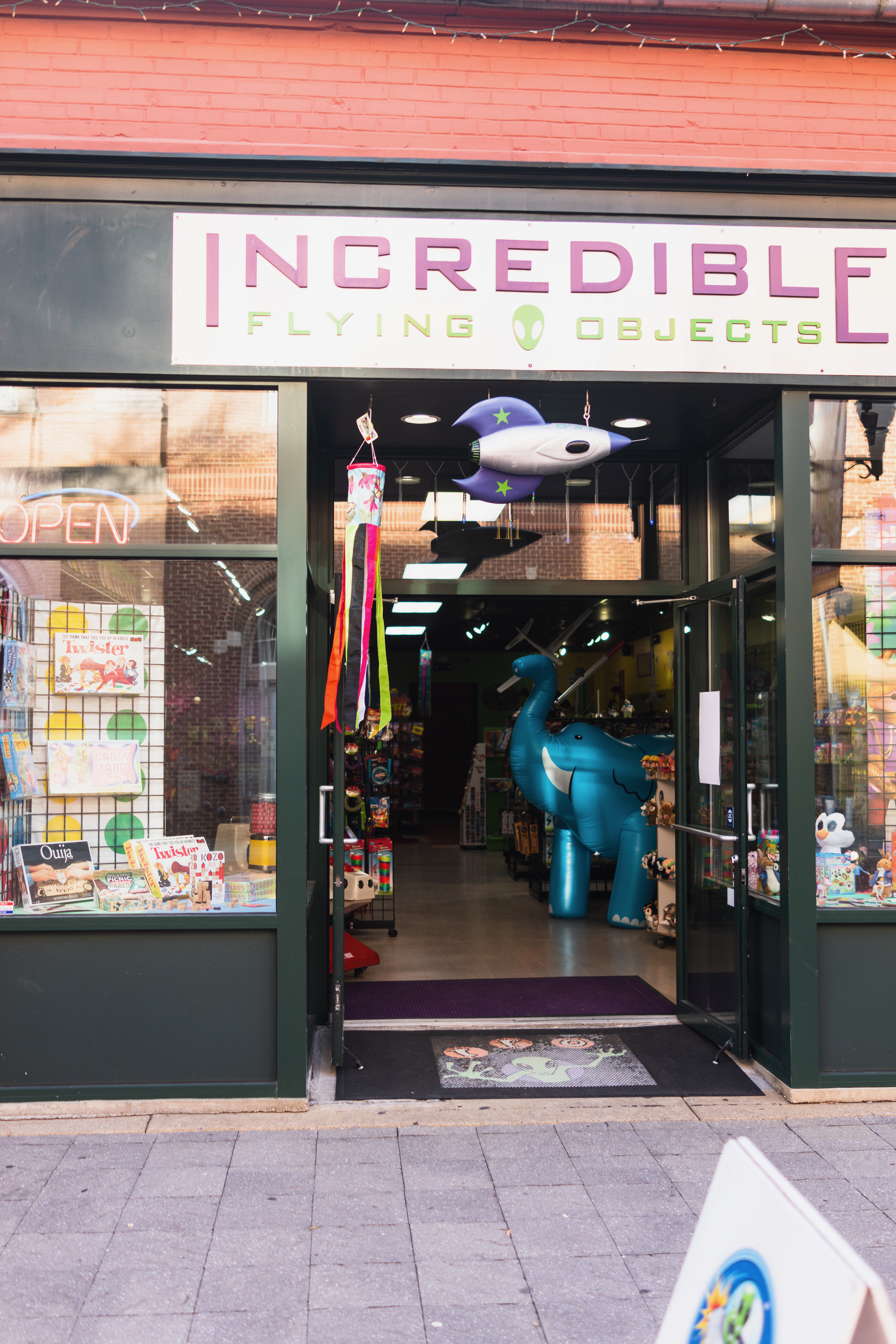 The photograph captures the inviting storefront of 'Incredible Flying Objects,' a toy shop bursting with color and creativity. An oversized blue elephant stands at the entrance, exuding a playful charm that beckons visitors inside. Bright lighting complements the vibrant decor, enhancing the shop’s cheerful, whimsical atmosphere.
