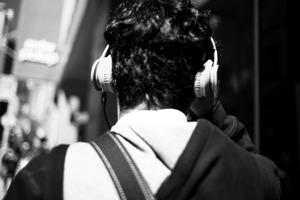 The photograph captures a figure from behind, wearing headphones, immersed in their own world amidst the bustle of the city. Black and white tones enhance the feeling of isolation, contrasting sharply with the lively urban backdrop. The composition draws the viewer's eye to the subject while evoking a sense of introspection in a chaotic environment.