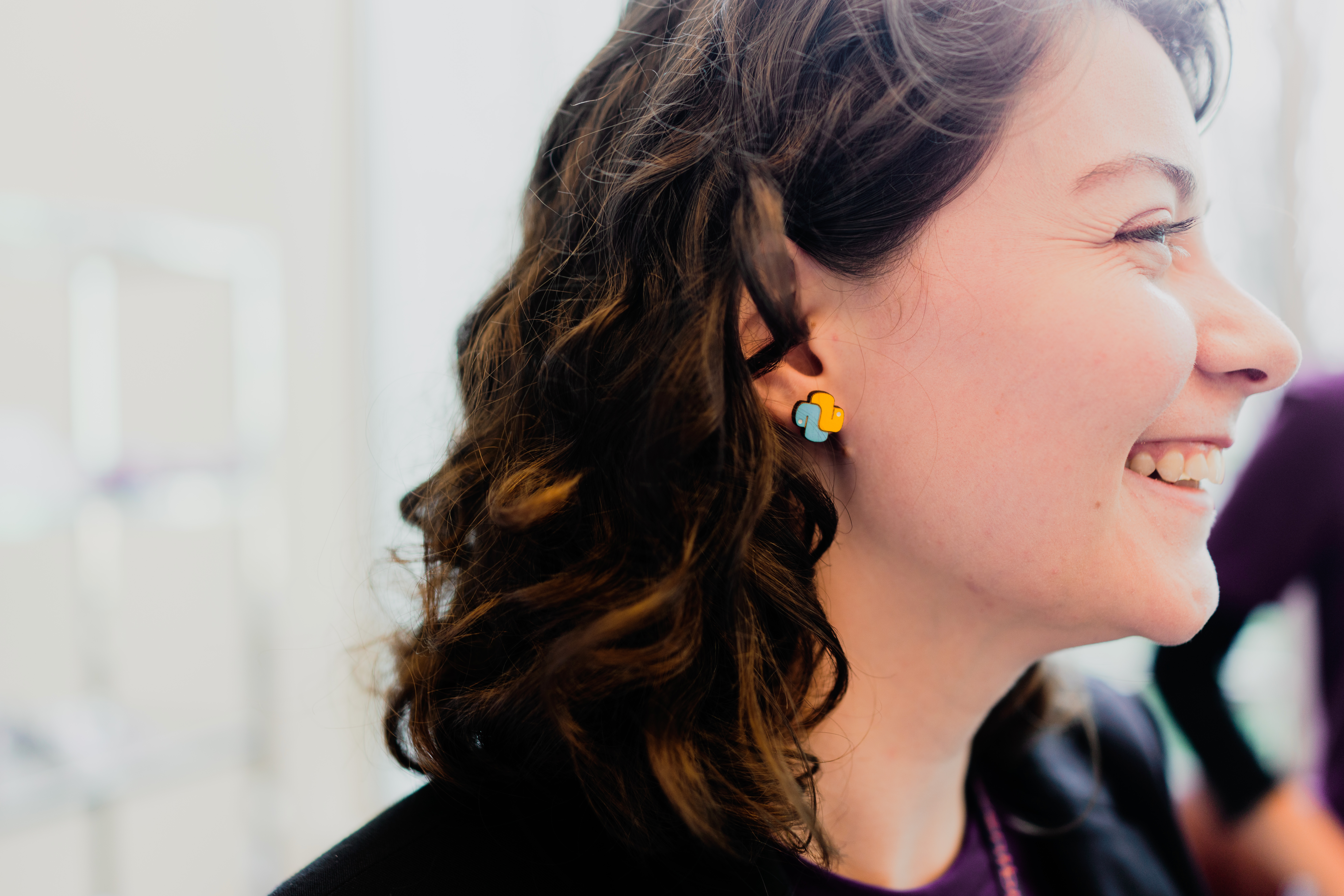 The photograph captures a young woman with curly hair, smiling brightly, showcasing colorful puzzle piece earrings that reflect her playful spirit. The soft, natural lighting accentuates her joyful expression and the warm tones of her features, creating an inviting and vibrant atmosphere. The blurred background adds depth, focusing attention on her face and accessories, enhancing the overall sense of happiness and individuality.
