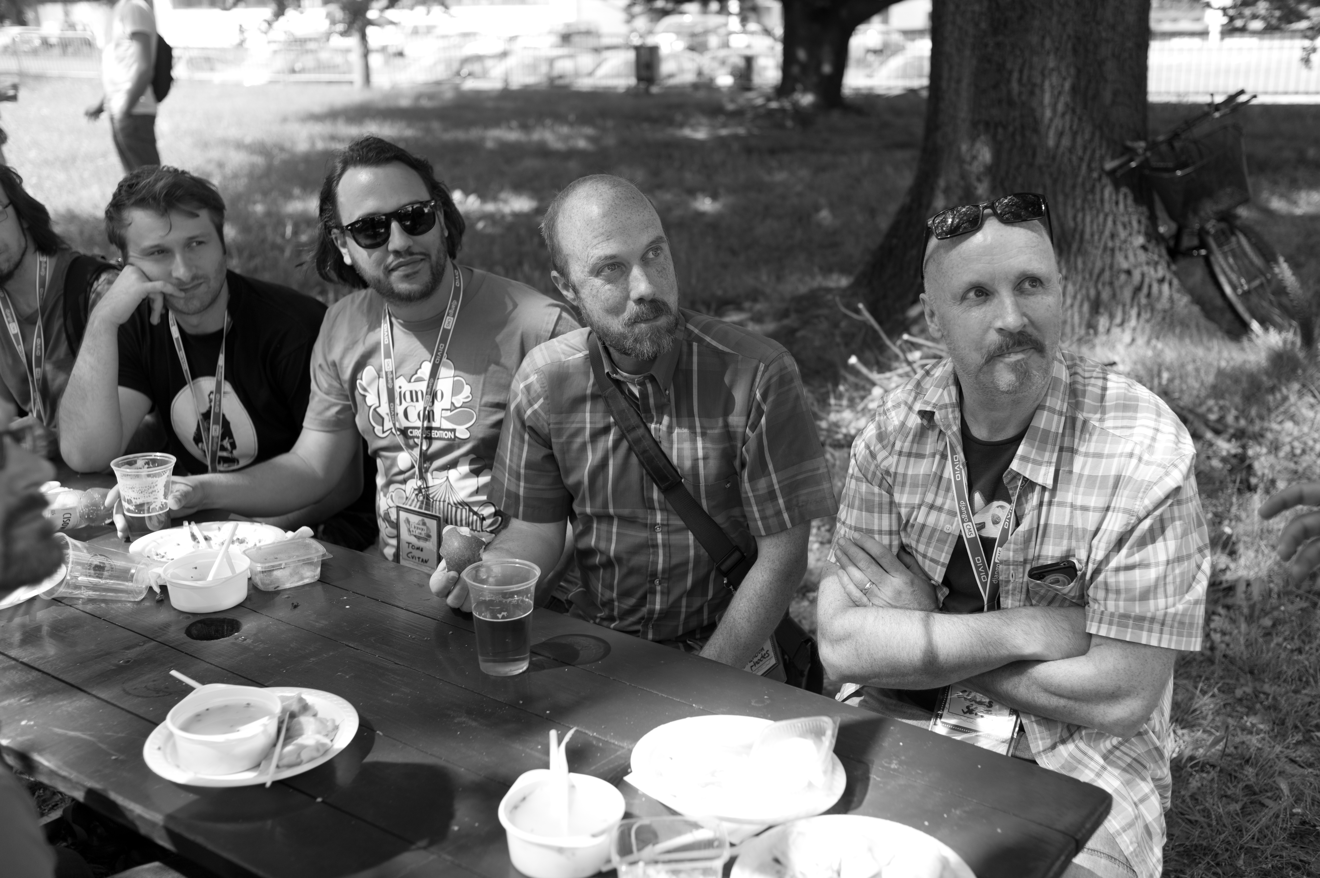 In this candid scene, a group of men sits in a sun-dappled park, engaged in a thoughtful discussion. The monochrome tone accentuates their expressions, revealing a mix of curiosity and contemplation, while the natural setting adds a serene backdrop to their gathering. The framing captures an intimate moment, inviting viewers to ponder the conversation happening around the table.