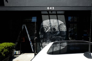 The photograph captures a striking mural of a skull, rendered in intricate lines, dominating the entrance of a building. Bright sunlight casts sharp contrasts, highlighting the details of the artwork while creating a stark mood against the dark backdrop. A ladder and partially visible worker add a sense of vitality and ongoing creativity to the urban scene, juxtaposing permanence and transience.
