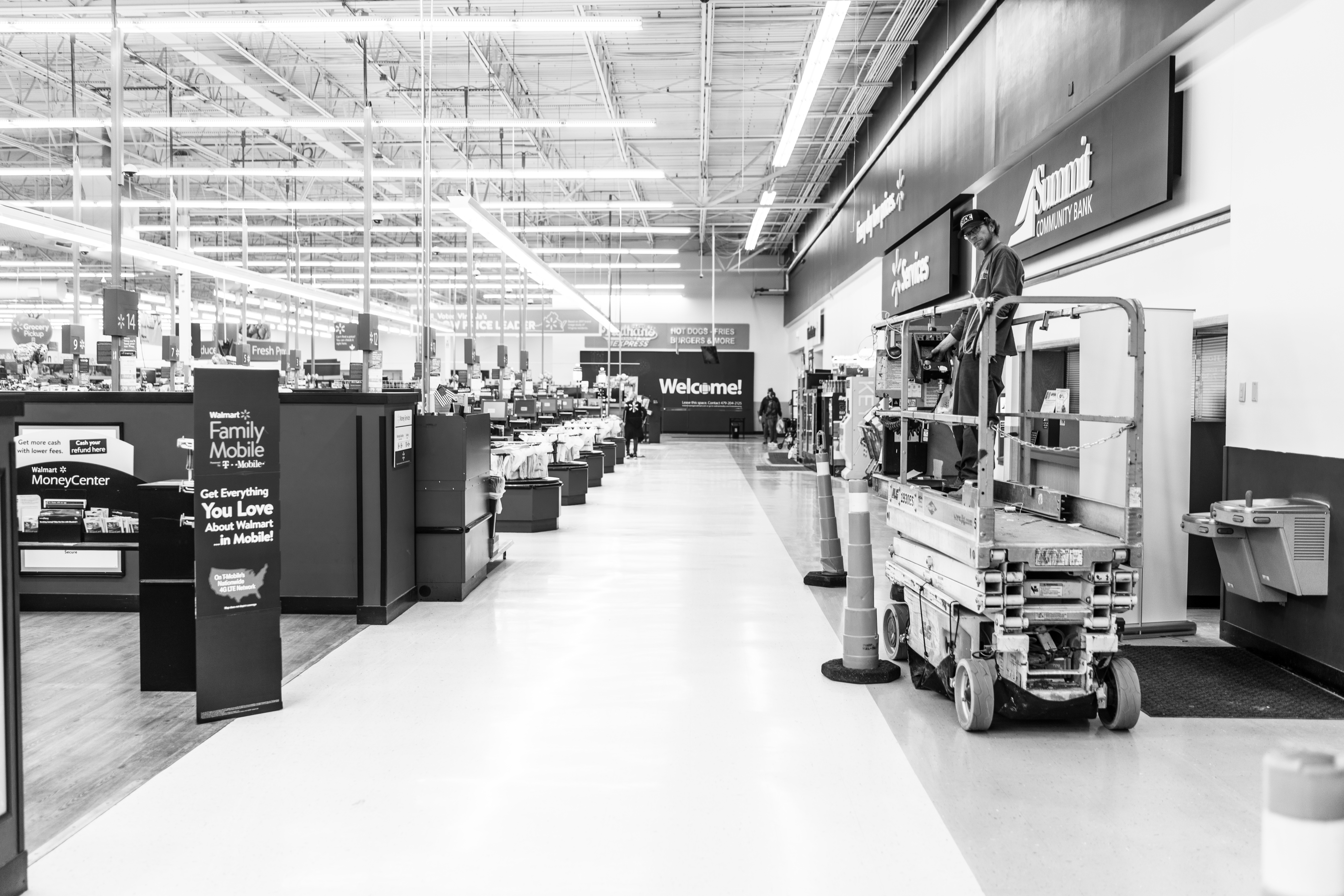 The photograph captures a stark, empty supermarket aisle, emphasizing a sense of stillness amid the backdrop of a busy retail environment. A solitary worker on a lift creates a focal point against the expansive, well-lit space, his presence lending a human touch to the structured, commercial setting. The monochrome palette enhances the mood of solitude and contemplation, inviting viewers to reflect on the interplay of labor and commerce.