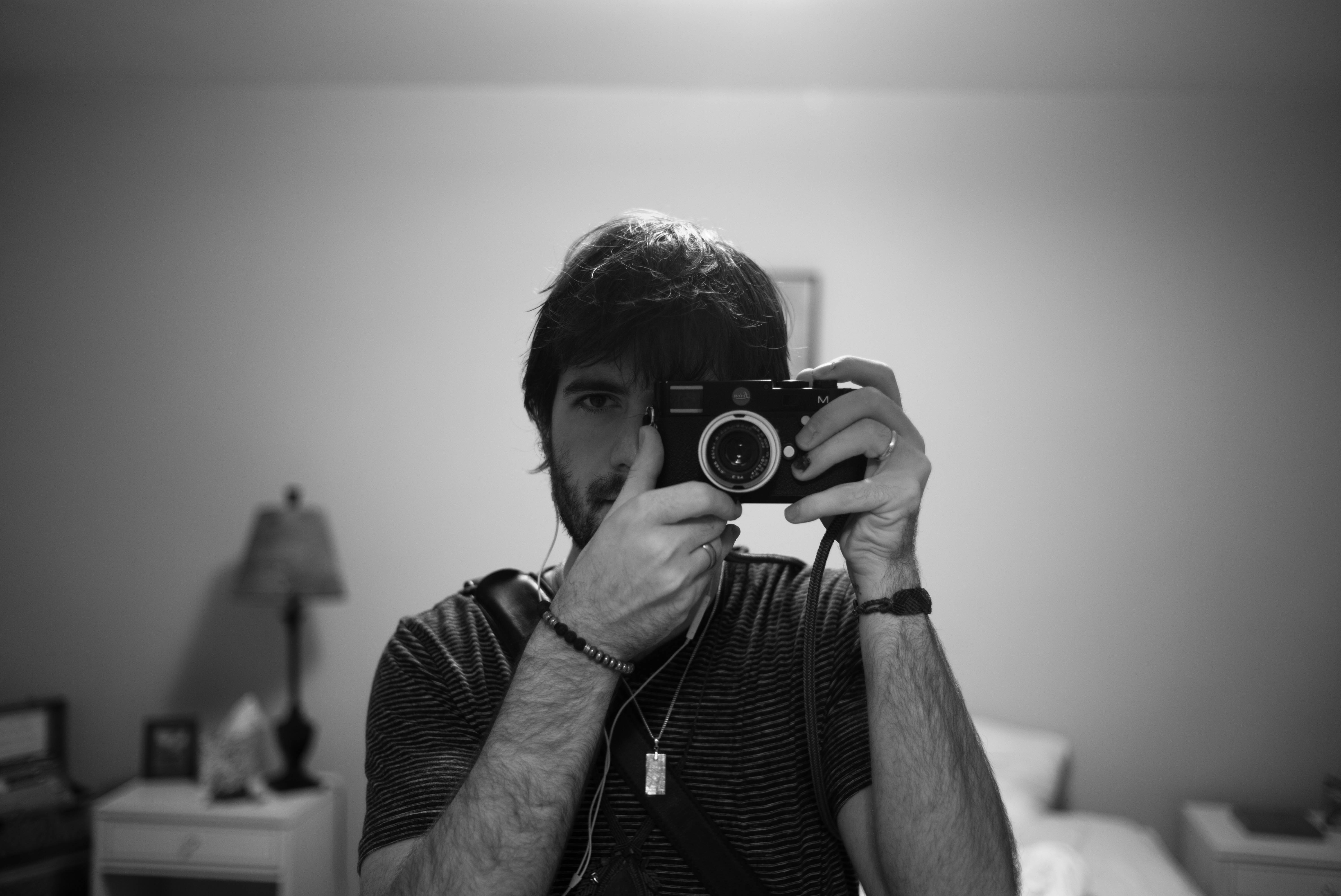 In this monochromatic self-portrait, the subject gazes directly at the camera while holding a vintage camera, creating a sense of intimacy and introspection. The soft, diffused lighting highlights texture in his hair and arms, while the blurred background suggests a personal space filled with untold stories. The composition draws the eye to his gaze, inviting viewers to ponder the duality of observer and observed.