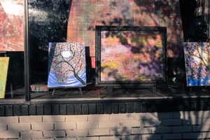The photograph captures a vibrant display of colorful paintings showcased in a sunlit window. Soft shadows play across the artwork, enhancing the textures and vivid hues, evoking a sense of creativity and warmth. The composition artfully combines the artworks with the natural elements outside, creating a harmonious blend of art and light.