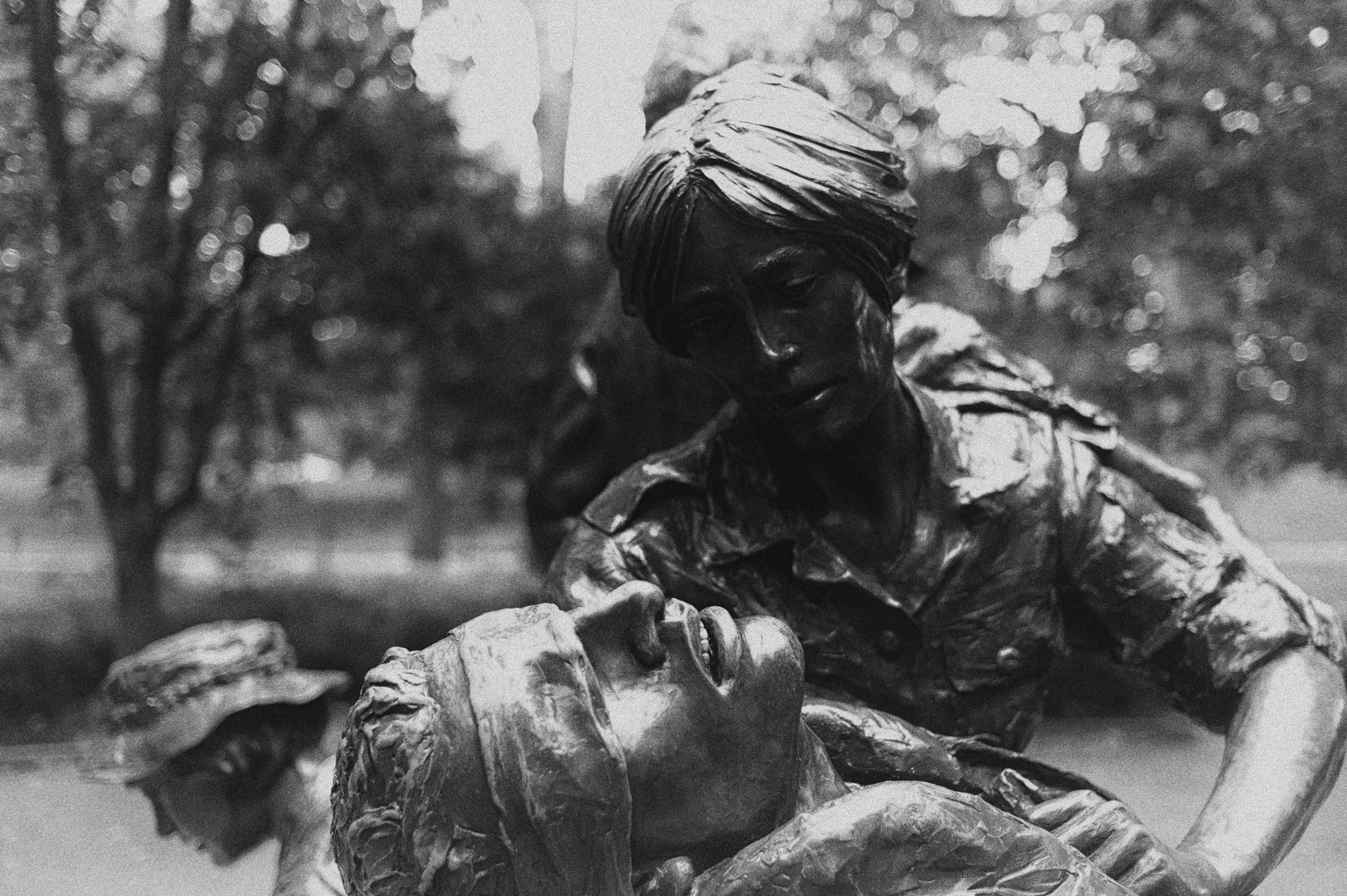 This poignant black-and-white photograph captures the intimate moment between two bronze sculptures depicting a soldier being cradled by a medic, conveying a profound sense of care and sacrifice. The soft, diffused lighting accentuates the expressions, highlighting the weight of their shared experience and the emotion etched into their forms. Surrounded by the blurred greenery of the park, the scene evokes a timeless reminder of compassion in times of crisis.