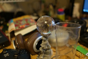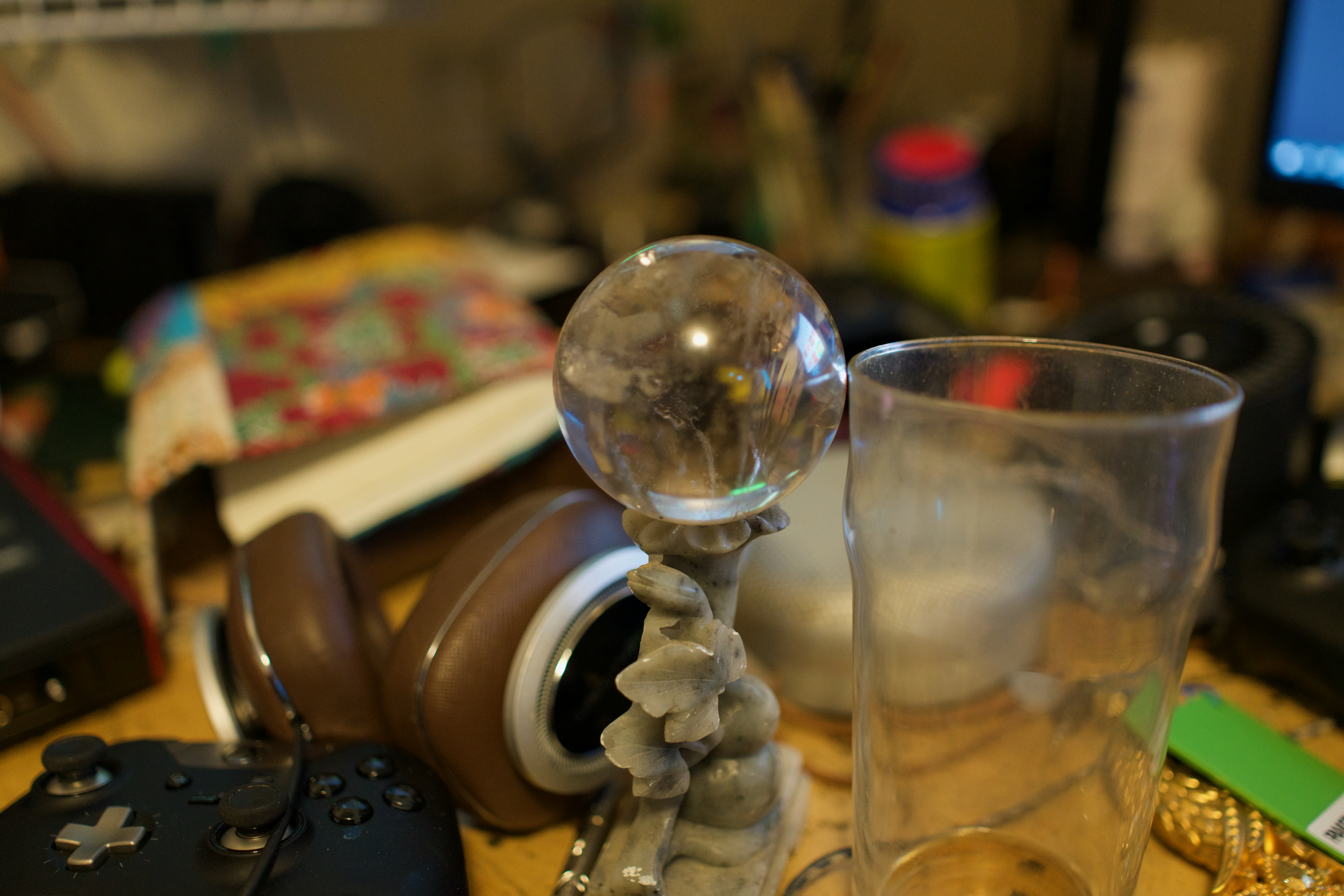 This photograph captures a moment of creative chaos, featuring a crystal ball atop a sculpted base surrounded by an array of everyday objects. The warm, soft lighting highlights the textures and contours of the items, creating an inviting yet cluttered atmosphere. The composition draws the eye to the central orb, evoking a sense of mystery amidst the vibrant distractions of a workspace.