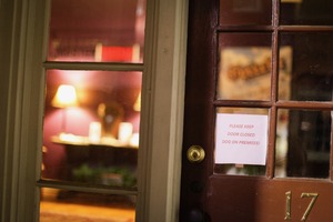 The photograph captures a wooden door adorned with a friendly warning sign, offering a glimpse into a warmly lit interior bathed in shades of purple. The inviting glow from a lamp contrasts softly with the darkened exterior, creating a cozy yet protective mood. The composition emphasizes the threshold between the outside world and the comfort within, inviting curiosity while maintaining a sense of boundaries.