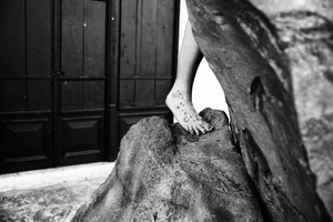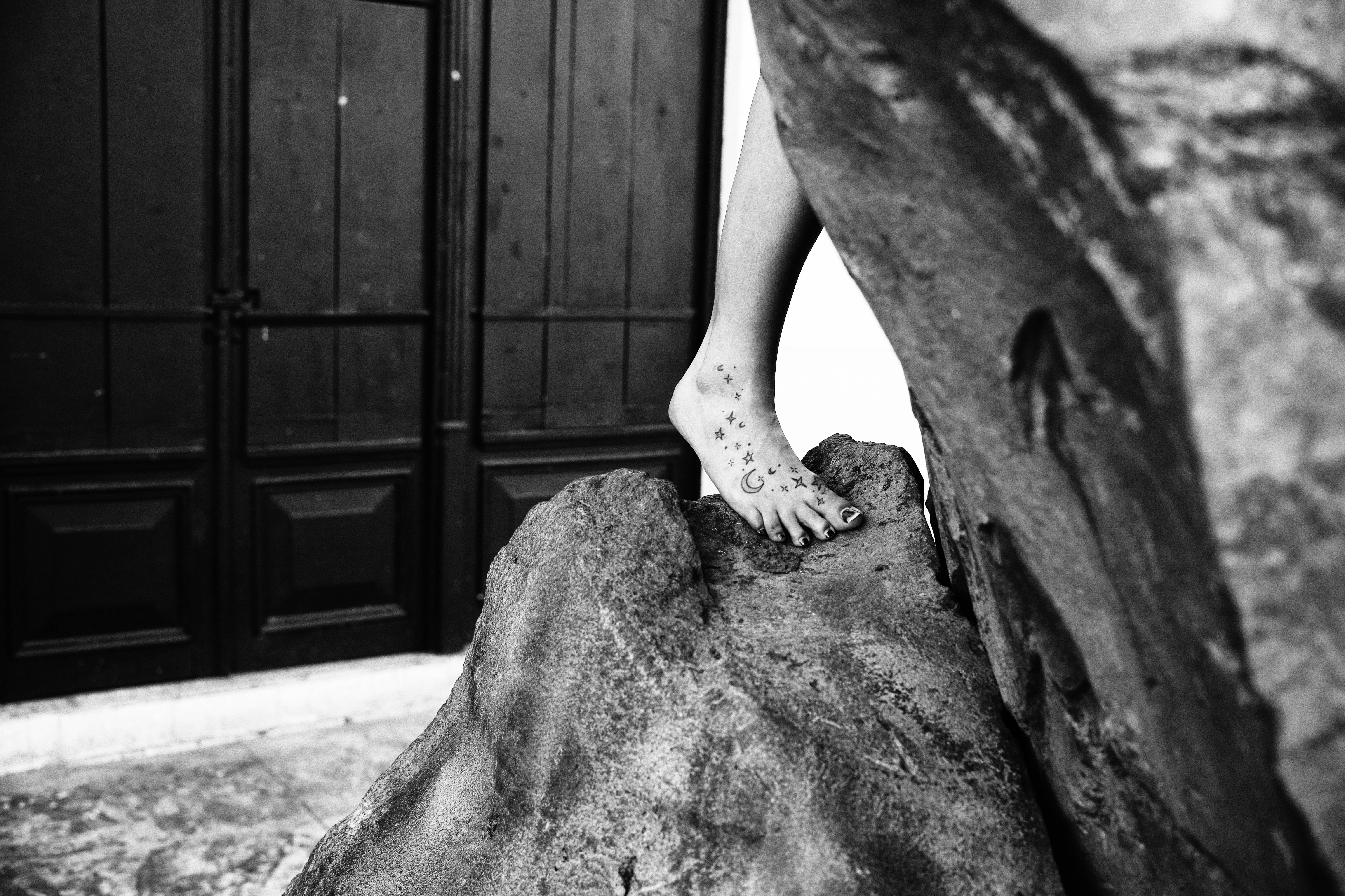 A solitary foot adorned with celestial tattoos rests on a rugged rock, evoking a sense of connection to nature. The black and white composition amplifies the mood of introspection, with the shadows creating a striking contrast against the textured surface. Behind, dark wooden doors frame the scene, adding depth and an air of mystery to the image.