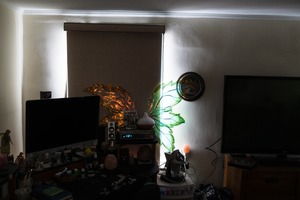 The photograph captures a cozy, dimly lit corner of a room, where intriguing objects clutter a desk beneath a softly glowing window. A striking contrast of shadows and light emerges as the illuminated leaves cast colorful reflections, creating an intimate and whimsical atmosphere. The overall mood is one of quiet contemplation, evoking a sense of mystery amidst the personal artifacts that fill the space.