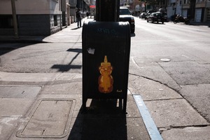 The photograph captures a whimsical street art piece—a bear with a condiment cap—adorned on a black mail post, standing out against the urban backdrop. Bright sunlight casts soft shadows, enhancing the playful mood, while the quiet street hints at the hustle of city life just beyond. The juxtaposition of the cheerful artwork against the gritty surroundings creates an intriguing visual narrative.