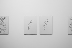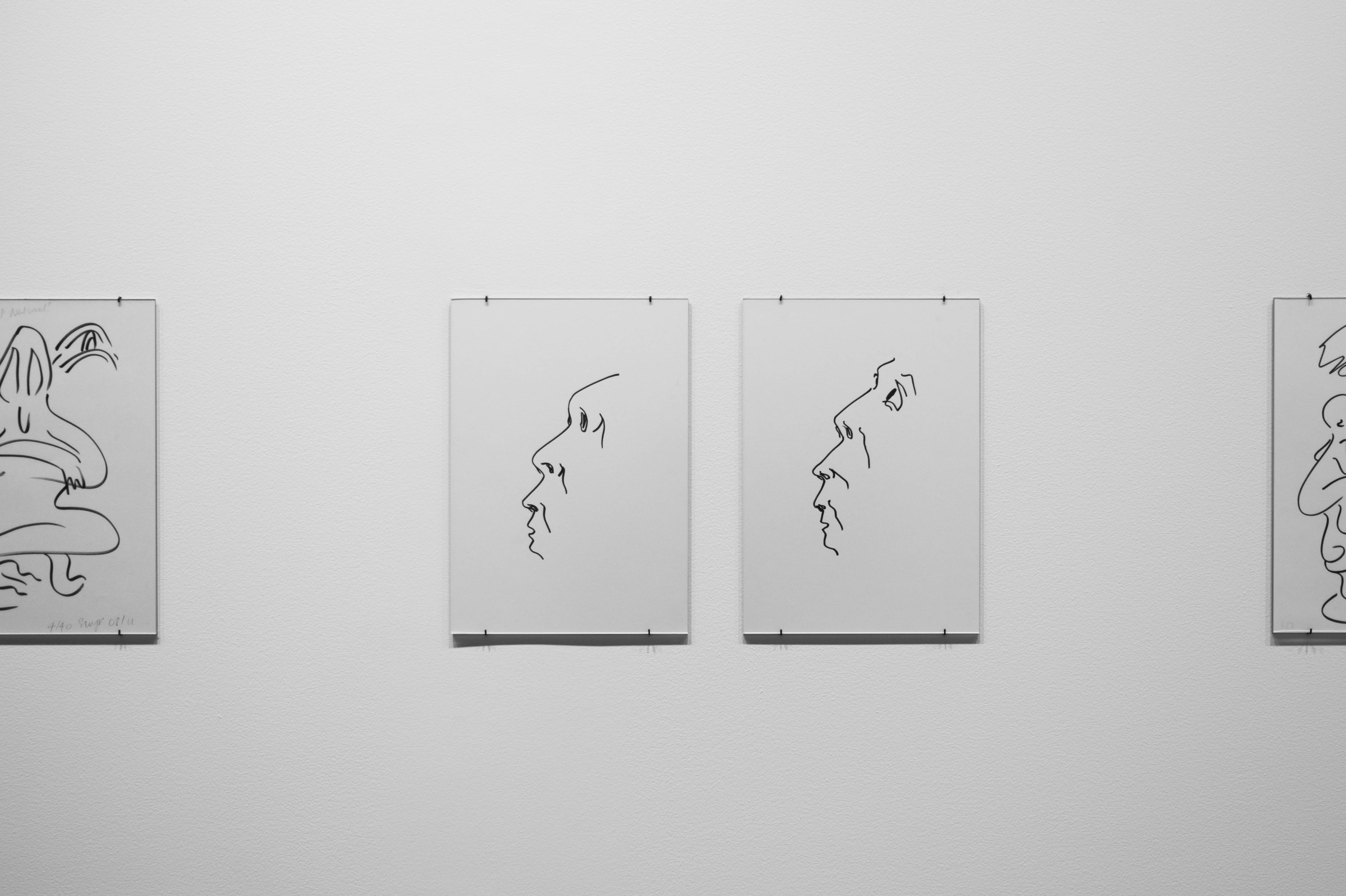 This photograph captures a minimalist display of three line drawings hung against a stark white wall, focusing on abstract profiles. The use of black ink on white paper creates a bold contrast, emphasizing the simplicity and elegance of the forms. The overall mood is contemplative, inviting viewers to engage with the subtleties of each face and the emotions they evoke.