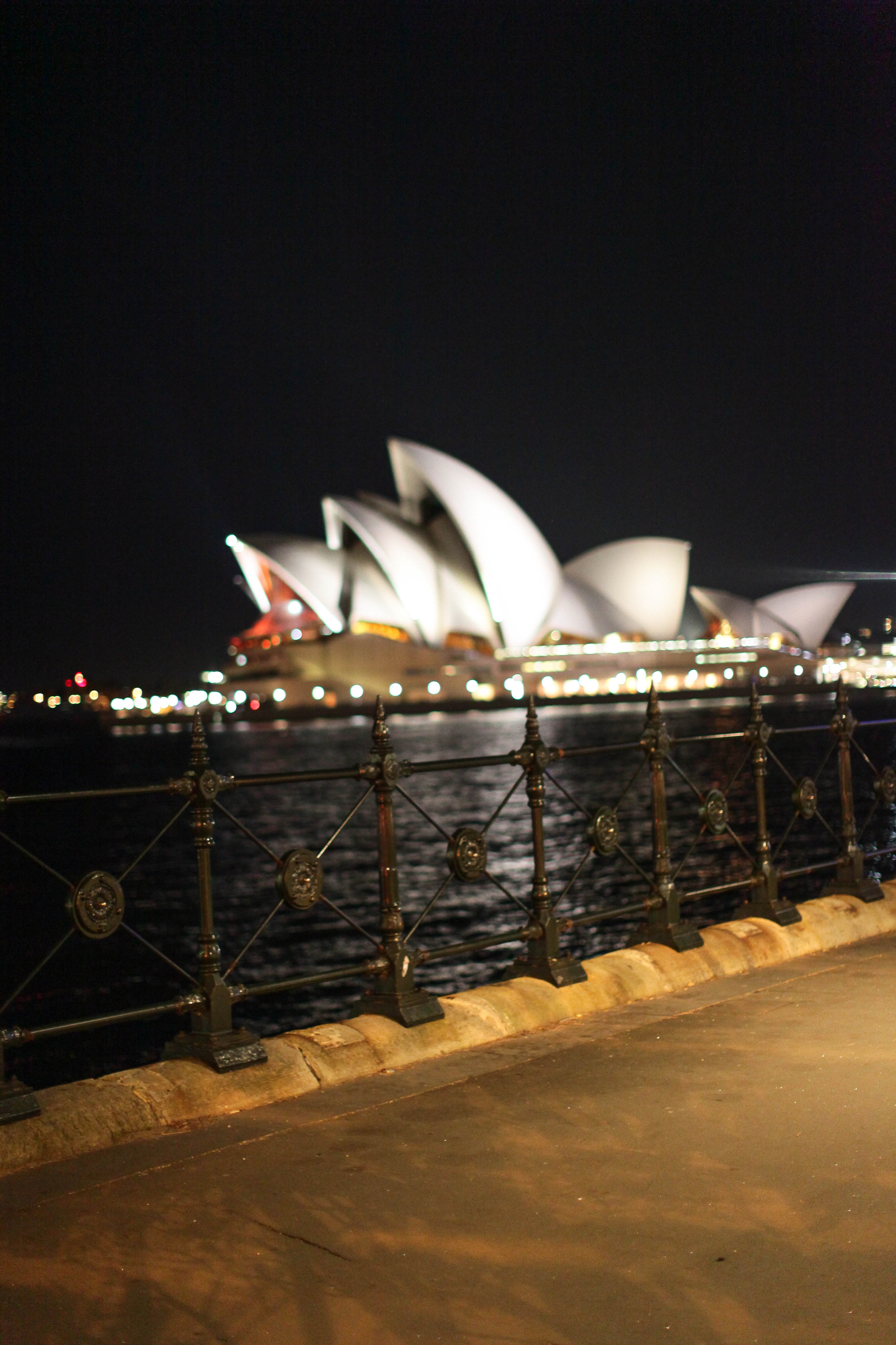 The photograph captures the Sydney Opera House illuminated against the night sky, its iconic sails softly glowing with warm lights. The foreground features a wrought-iron fence that frames the scene, adding a sense of intimacy and depth. A tranquil mood permeates the image, with the shimmering water reflecting the architectural marvel, embodying the charm of a nighttime urban landscape.