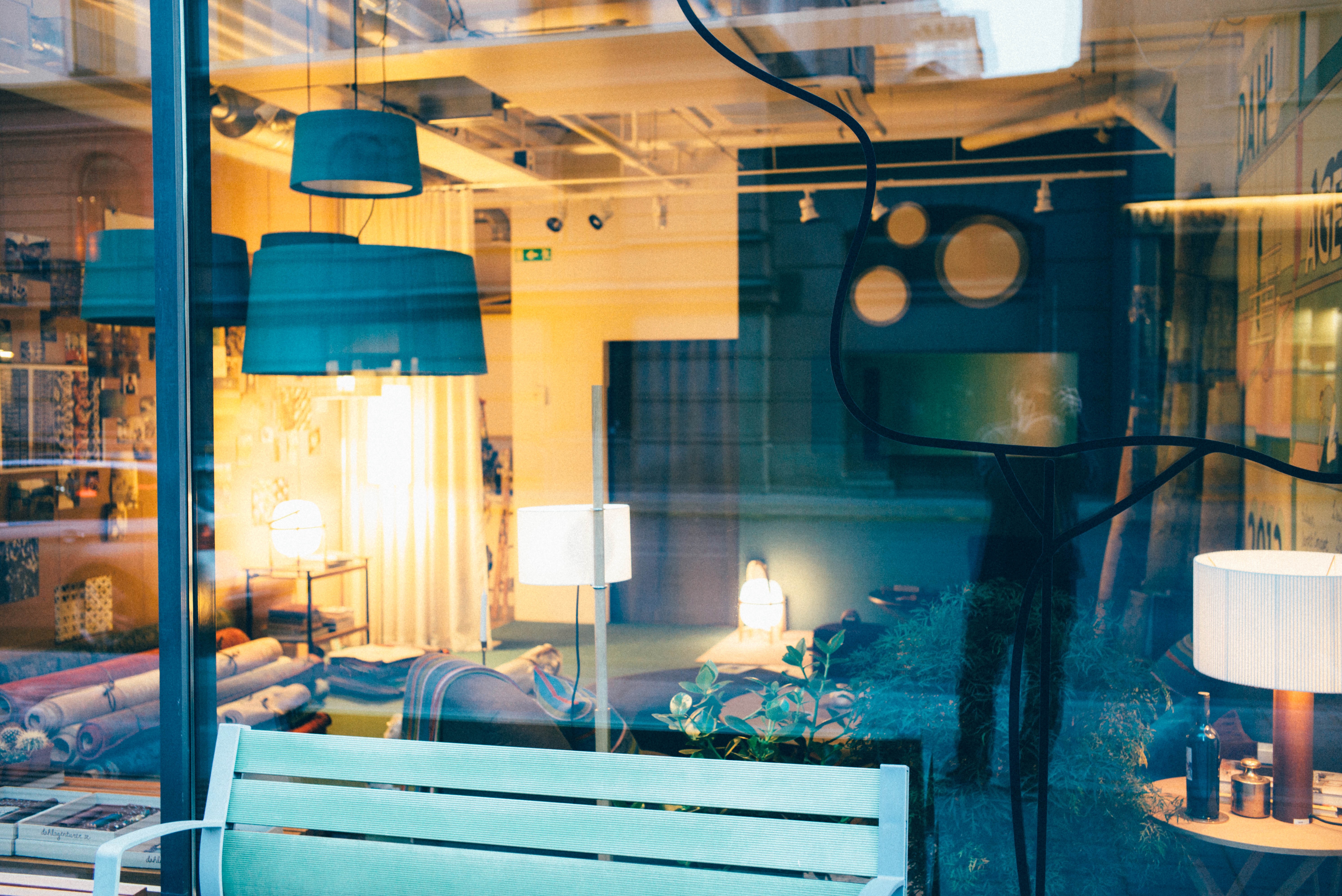 This photograph captures a cozy interior through a glass window, revealing soft lighting and inviting decor. The interplay of light and shadow creates a tranquil mood, while the vibrant colors of the hanging lamps pop against the muted backdrop. A simple green bench in the foreground balances the composition, leading the eye into the warm sanctuary beyond.