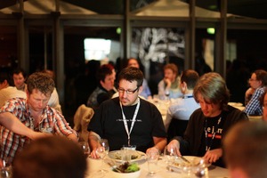 The photograph captures a group of attendees seated at a dinner table, immersed in their meal and conversation. The warm, intimate lighting creates a welcoming atmosphere, while the focused expressions of the individuals suggest deep engagement in their discussions. Subtle background activity hints at a lively gathering, enhancing the sense of community and connection among the diners.