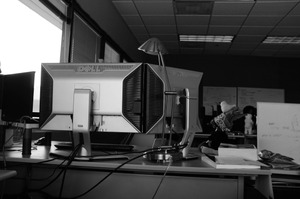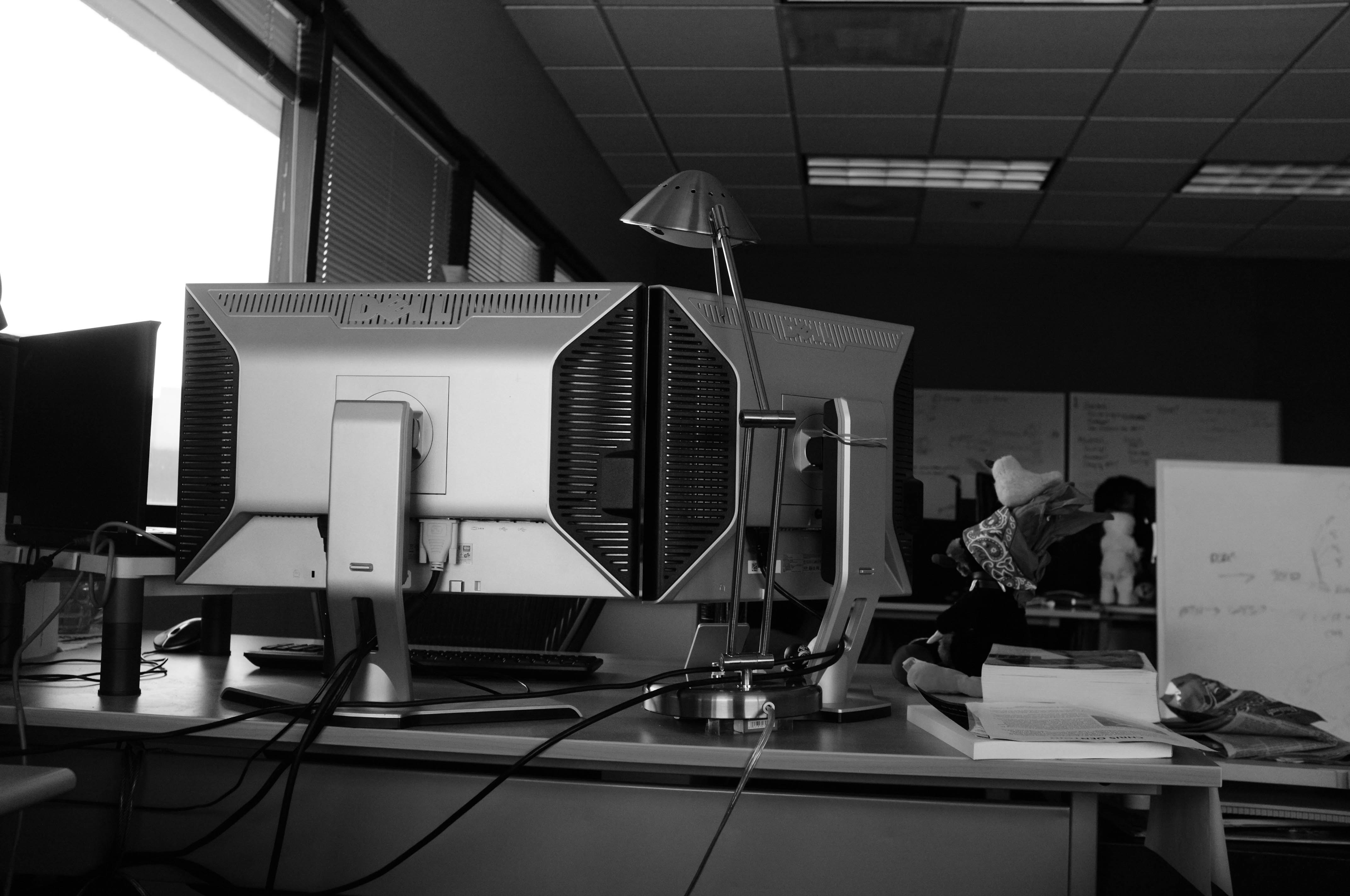In the stark setting of an office, two monitors dominate a cluttered desk, flanked by a desk lamp and scattered papers. The black-and-white composition evokes a sense of solitude and focus, while the soft light from the window hints at the outside world beyond. A playful plush toy adds a touch of whimsy amidst the otherwise serious environment.