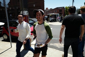 In a bustling urban setting, two friends exude a carefree energy as they stroll along the sidewalk, drinks and pastries in hand. The bright sunlight illuminates their smiles, creating a cheerful atmosphere, while the casual clothes add to the relaxed vibe of their outing. Background activity hints at a lively street scene, enhancing the sense of community and enjoyment in this sunny day.