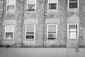 This monochrome photograph captures a young figure gazing out from a window of a weathered brick building, creating an atmosphere of introspective solitude. The stark contrasts and textured surfaces highlight a sense of abandonment, while the single subject draws the viewer's attention and evokes curiosity about their thoughts. The soft, natural light filtering through the window adds a layer of poignancy to the scene, enhancing its emotional depth.