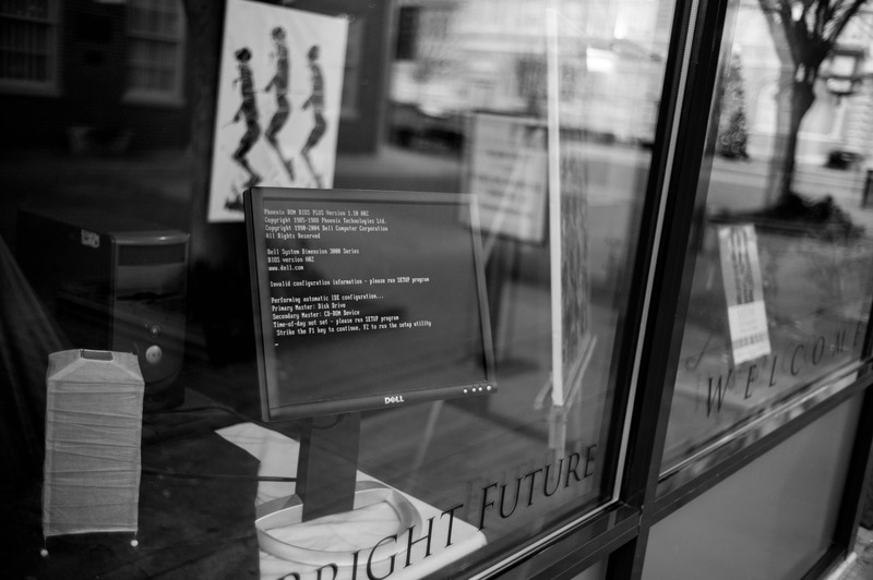 This monochrome photograph captures a computer screen displaying a firewall configuration error, juxtaposed against the lively street outside. The stark contrast between the digital failure and the hopeful 'Bright Future' sign adds a sense of irony, evoking a mood of nostalgia and innovation. The reflections in the glass create layers of depth, merging the technological with the everyday life beyond the window.