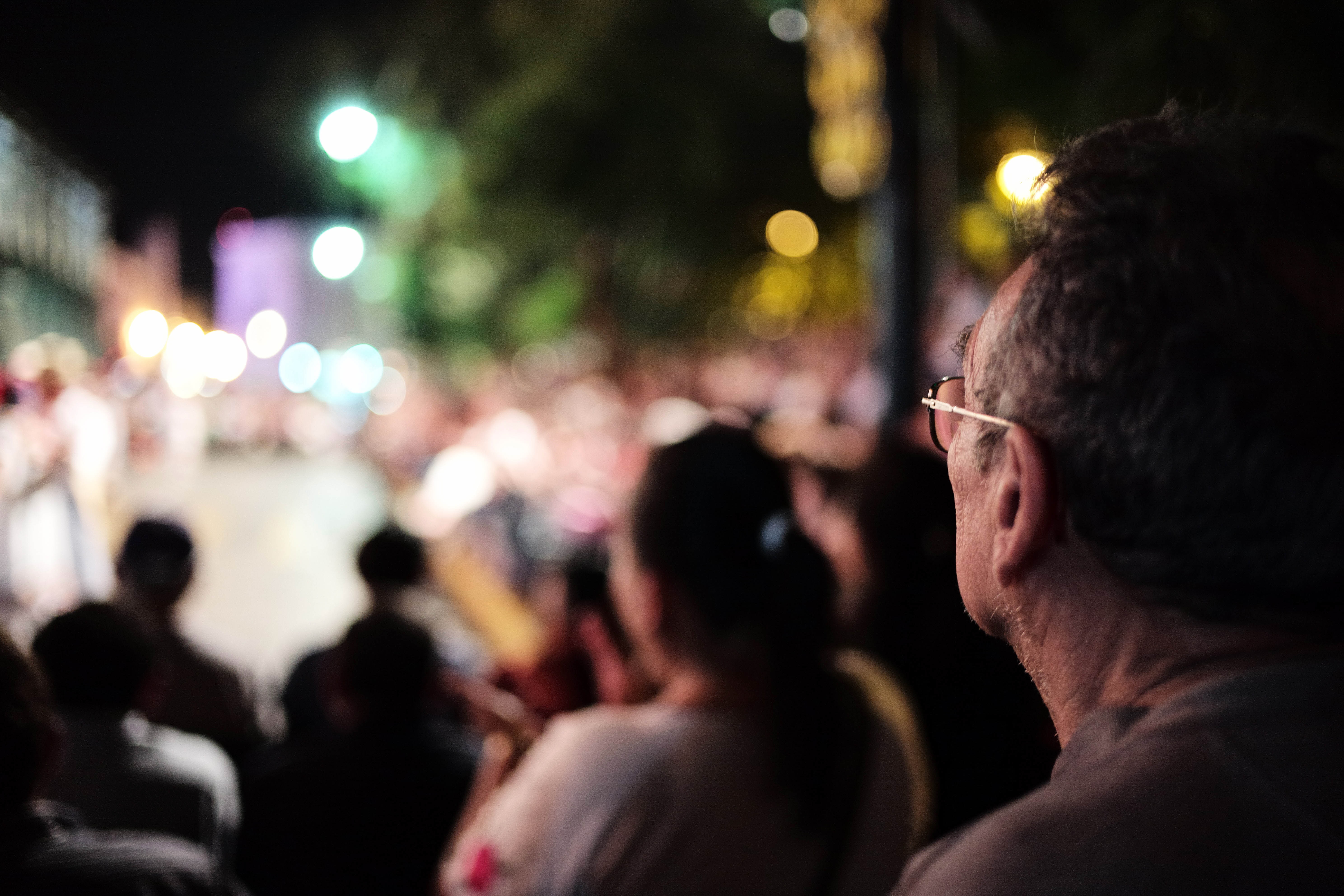 In a dimly lit space filled with spectators, an older man gazes intently towards a distant performance, his profile sharply defined against a blurred backdrop of vibrant lights. The mood is contemplative and nostalgic, with the warm glow of lights casting a soft ambiance that envelops the scene. The composition draws attention to his thoughtful expression while capturing the collective excitement of the crowd, creating an intimate yet expansive atmosphere.