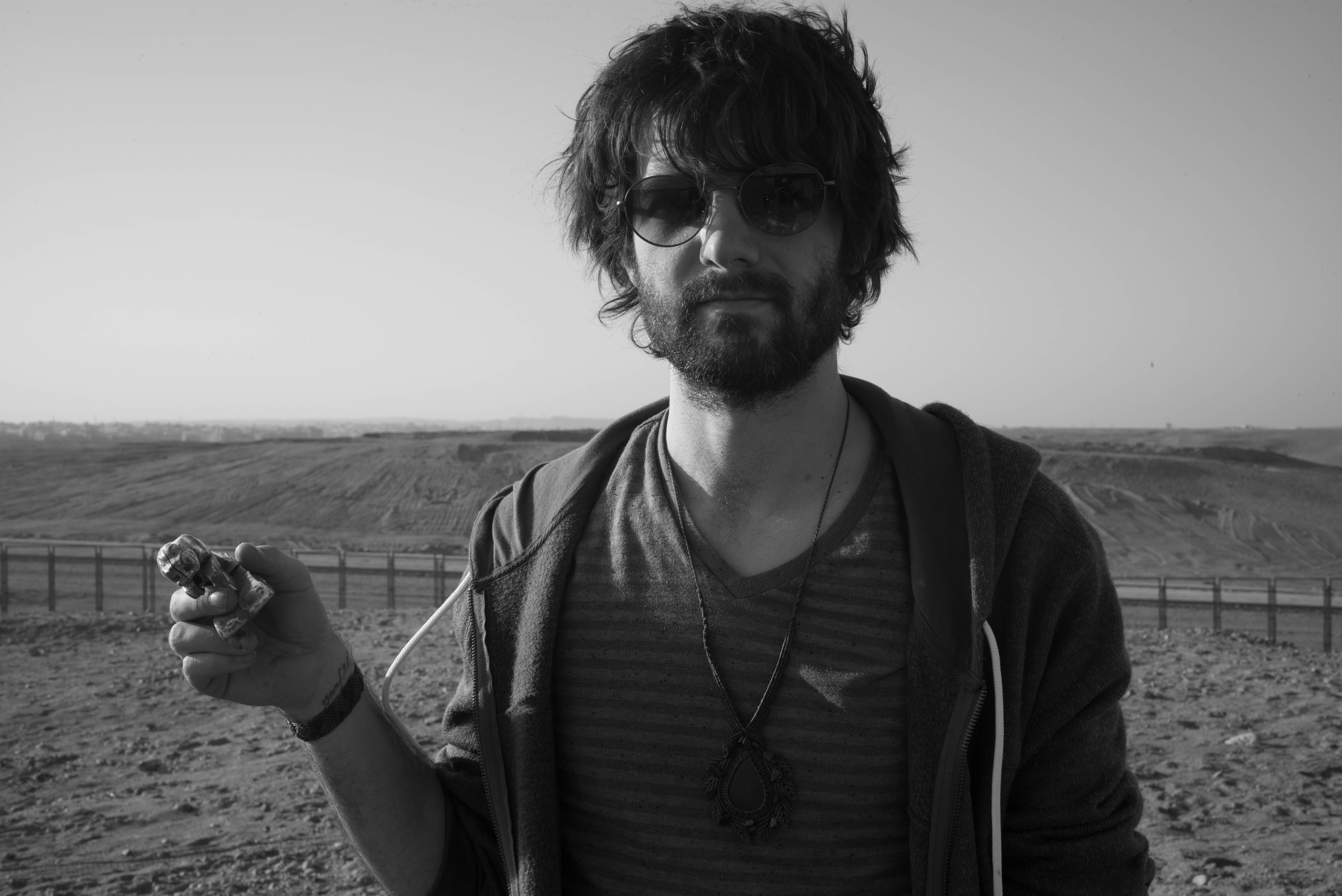 A pensive young man stands against a barren landscape, his expression contemplative as he holds a small object in his hand. The monochromatic tones and soft lighting evoke a sense of introspection, while the distant horizon creates a feeling of solitude. His casual attire and sunglasses add a relaxed yet somewhat mysterious ambiance to the scene.
