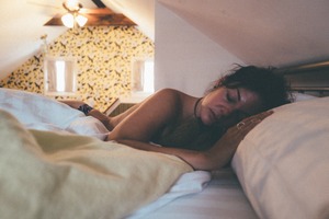 In a cozy attic room bathed in soft, natural light, a woman lies peacefully asleep, her expression serene and introspective. The warm tones of the bedding and floral wallpaper create an inviting atmosphere, enhancing the intimate mood of the scene. The composition highlights the harmony between the subject and her surroundings, evoking a sense of tranquility and restful solitude.