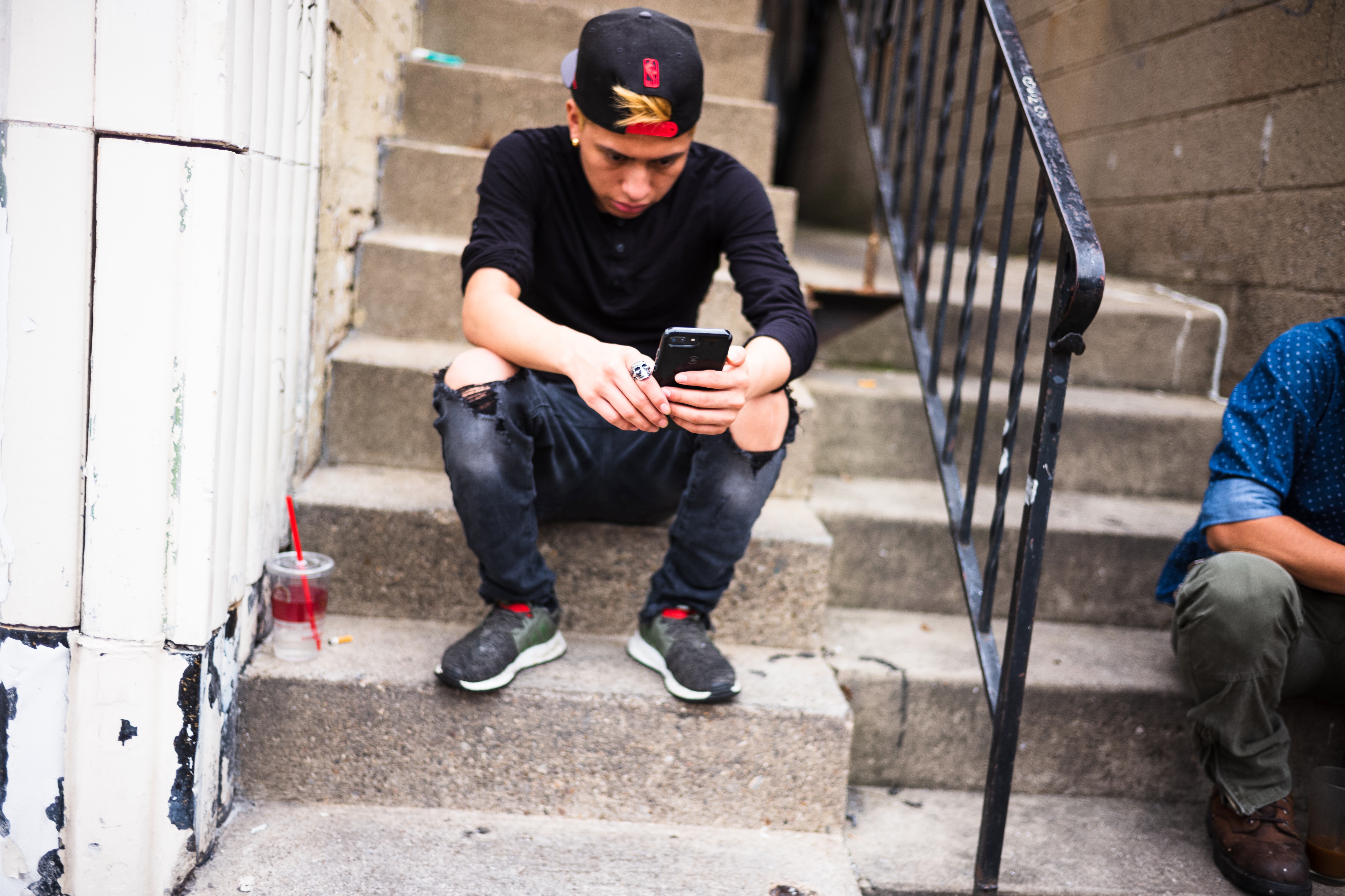 In an urban setting, a young individual sits on concrete steps, absorbed in their phone, exuding a sense of isolation within the bustling environment. Soft, natural light casts gentle shadows, highlighting the textures of the weathered stone and the casual attire of the subjects. This composition captures a moment of modern solitude, contrasting the intimacy of personal technology against a backdrop of gritty urban life.
