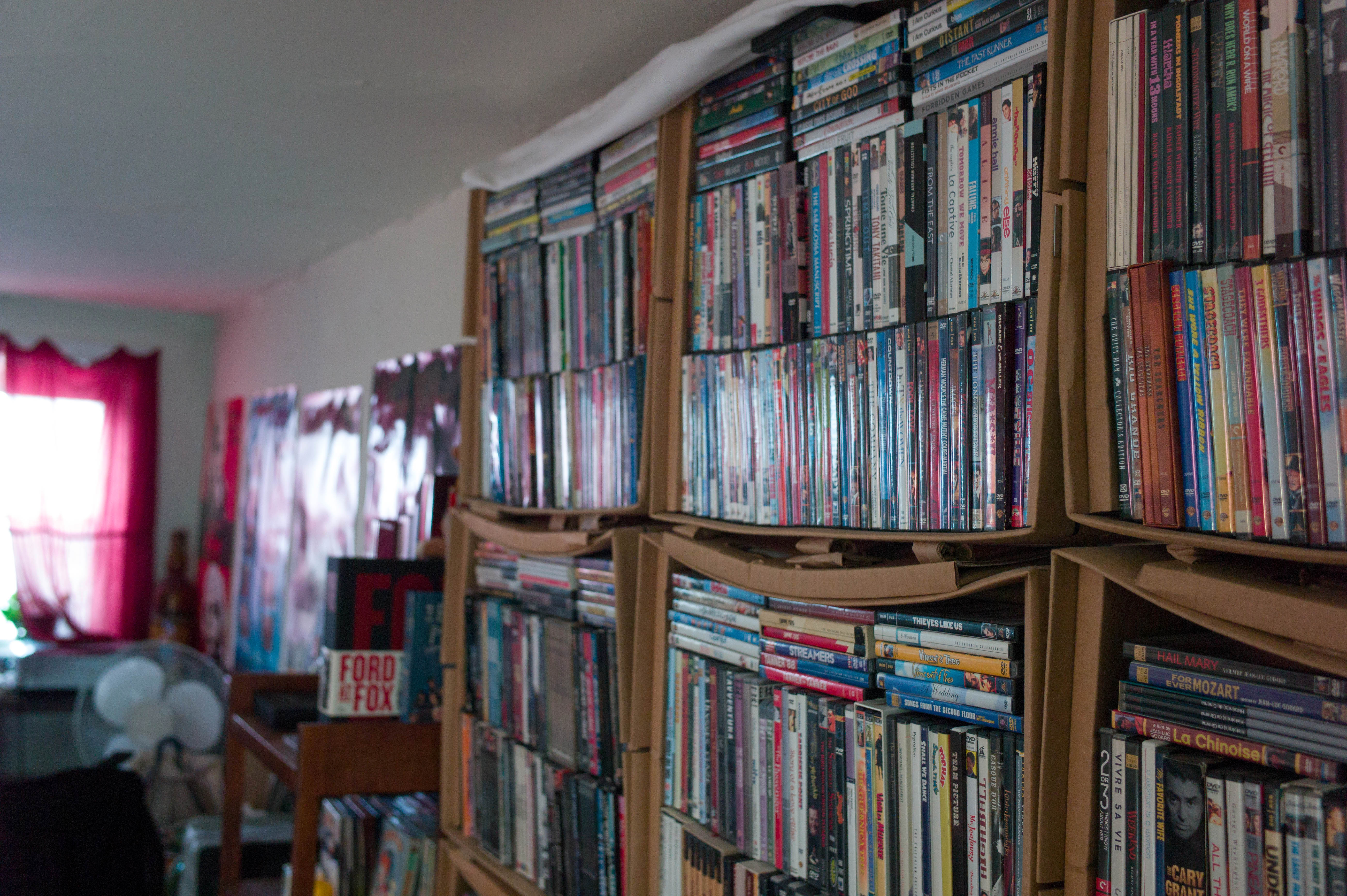 The photograph captures a cozy corner filled with shelves bursting with DVDs, evoking a sense of nostalgia and warmth. Soft daylight filters through a nearby window, illuminating the myriad of colorful covers, while inviting shadows play against the walls, creating a contemplative mood. The cluttered but intimate space reflects a lover of cinema, suggesting countless stories yet to be experienced.