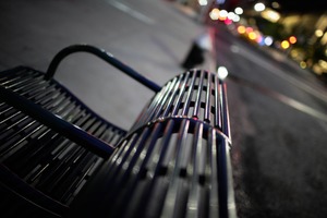 The photograph captures the sleek, metallic design of a bench, framed with a shallow depth of field that emphasizes its curves and lines. Soft, diffused lights from the street create a moody ambiance, enhancing the sense of isolation in an urban landscape. The composition draws the eye along the bench, inviting contemplation in the tranquil night setting.