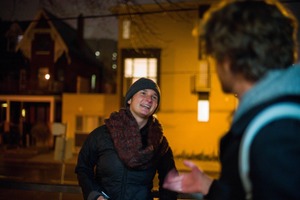 In this intimate nighttime scene, a woman in a warm scarf and beanie beams with joy while engaged in conversation with a companion. The soft, golden glow of nearby buildings contrasts with the cool night, creating a warm and inviting atmosphere. The blurred figure of the man adds focus on the woman's expressive face, enhancing the mood of connection and camaraderie.