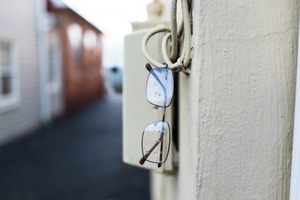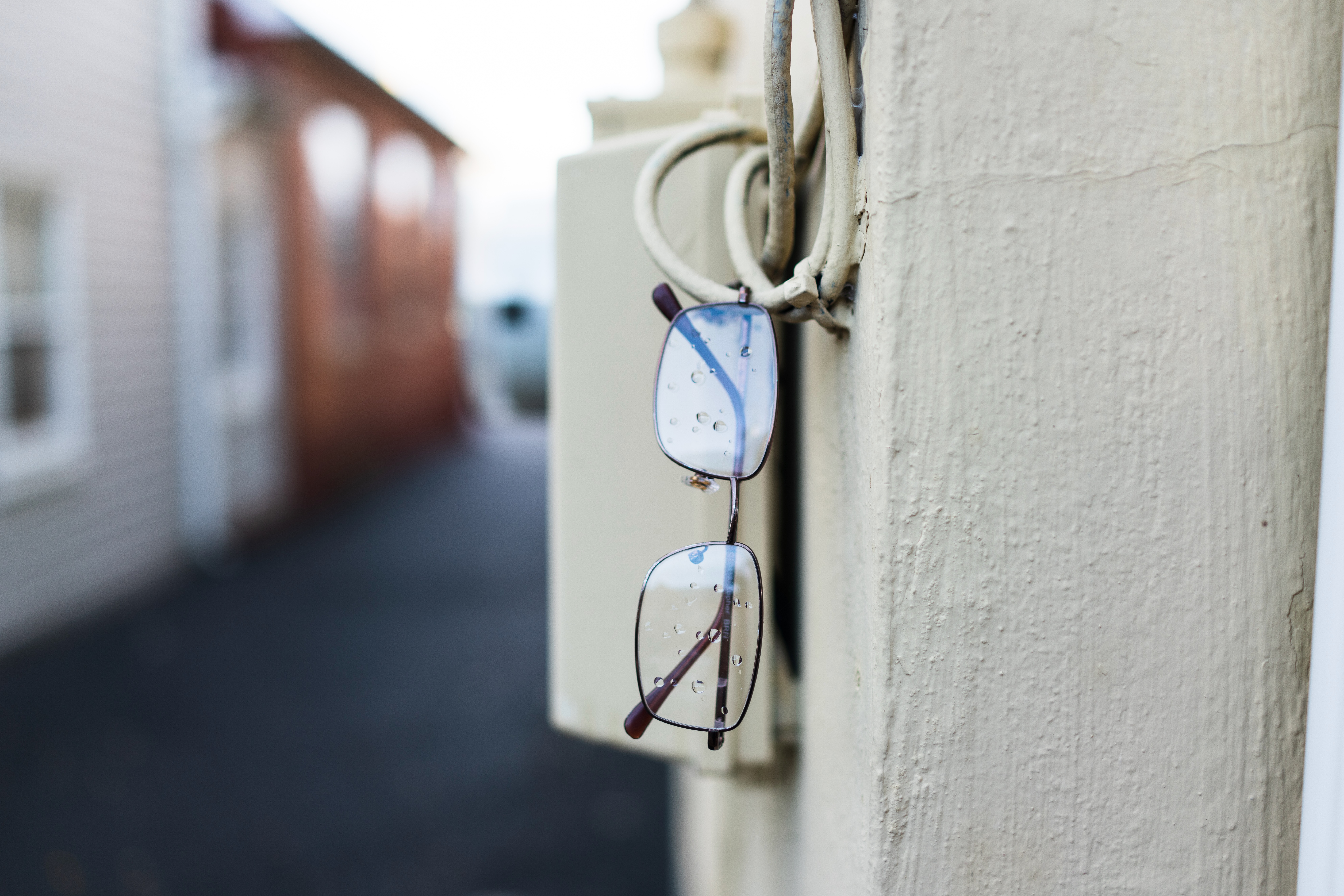 A pair of eyeglasses dangles from a wire against a softly blurred alleyway backdrop. The droplets of water on the lenses catch the light, evoking a sense of melancholy and abandonment. The neutral tones and shallow depth of field instill a quiet mood, drawing attention to the solitary object amidst a hint of urban life.