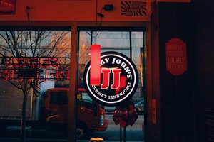 This photograph captures the inviting glow of a sandwich shop sign against a backdrop of muted urban colors. The warm lighting creates a cozy atmosphere, while the reflective surfaces add depth and interest to the composition. Outside, the hints of twilight and silhouettes hint at a bustling city life beyond the glass.