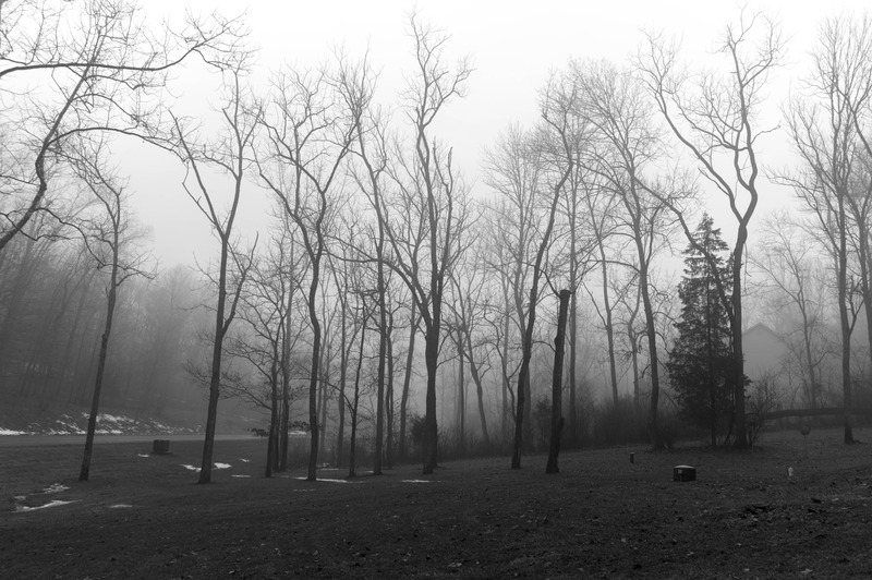 This monochromatic photograph captures a haunting landscape shrouded in mist, where bare trees reach upwards like skeletal fingers. The soft, diffused light creates an ethereal mood, evoking feelings of solitude and introspection. The composition draws the viewer's eye through the fog, hinting at the mystery that lies beyond the thick veil.