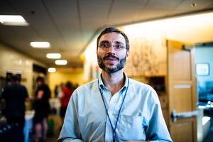 A casually dressed man stands in a bright, inviting space, his expression warm and open. The background buzzes with the blurred activity of others, enhancing the feeling of a vibrant, communal atmosphere. Soft lighting highlights his features, casting a friendly glow that accentuates the engaging nature of his presence.