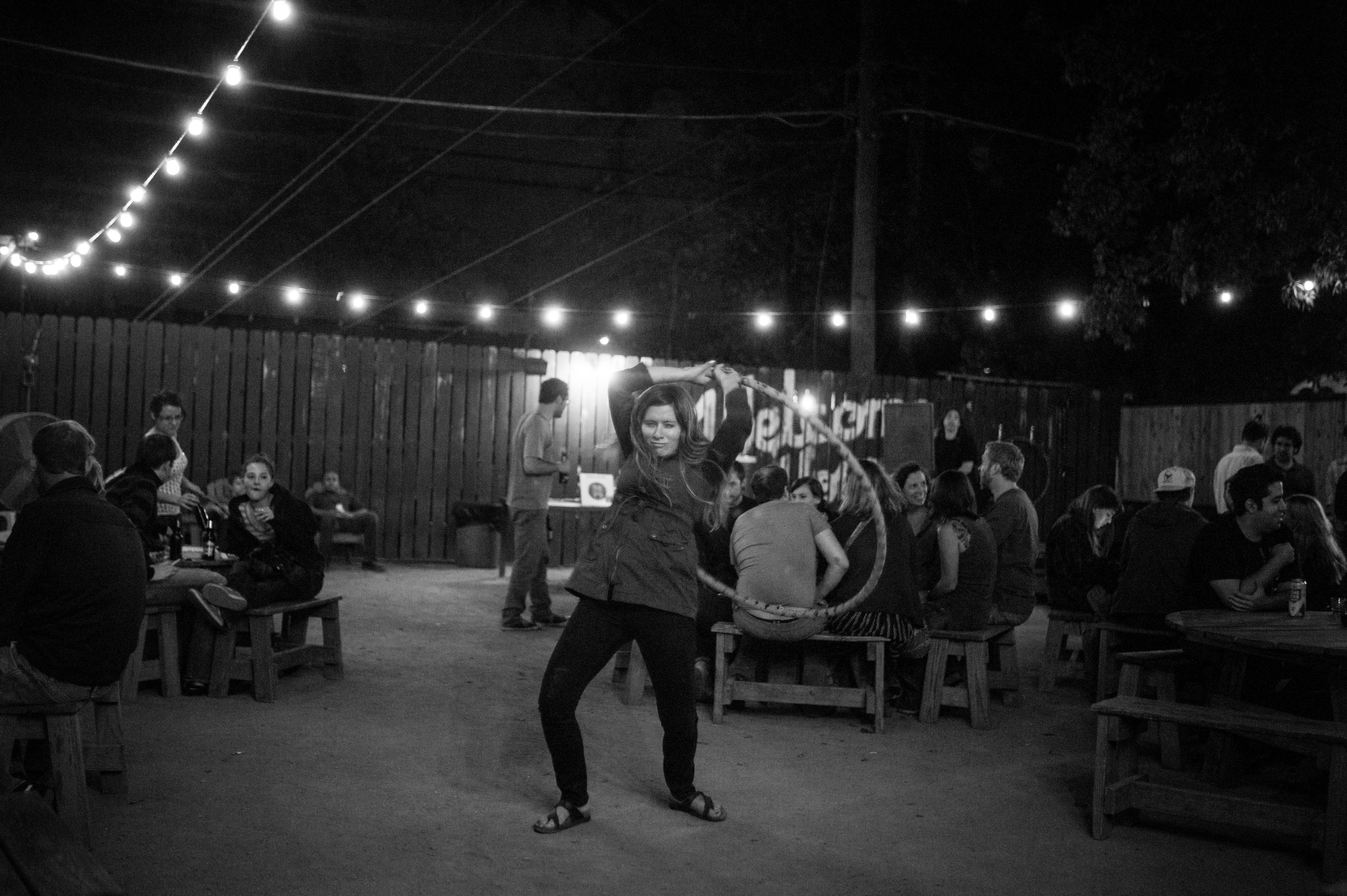 A lively night scene captures a woman hula hooping confidently against a backdrop of rustic wooden tables and a dimly lit yard. The warm glow of string lights hangs above, creating an inviting atmosphere, while her joy contrasts with the relaxed demeanor of onlookers. This black-and-white composition emphasizes the energy and spontaneity of the moment, leaving a lasting impression of community and celebration.