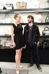 In a chic boutique, a woman in a sleek black dress shares a joyful laugh with a casually dressed man, their chemistry evident in their playful interaction. Soft lighting accentuates their expressions, creating a warm and inviting atmosphere against a backdrop of stylish handbags. The composition balances the subjects with the elegant accessories, lending an air of fashion and lightheartedness to the scene.