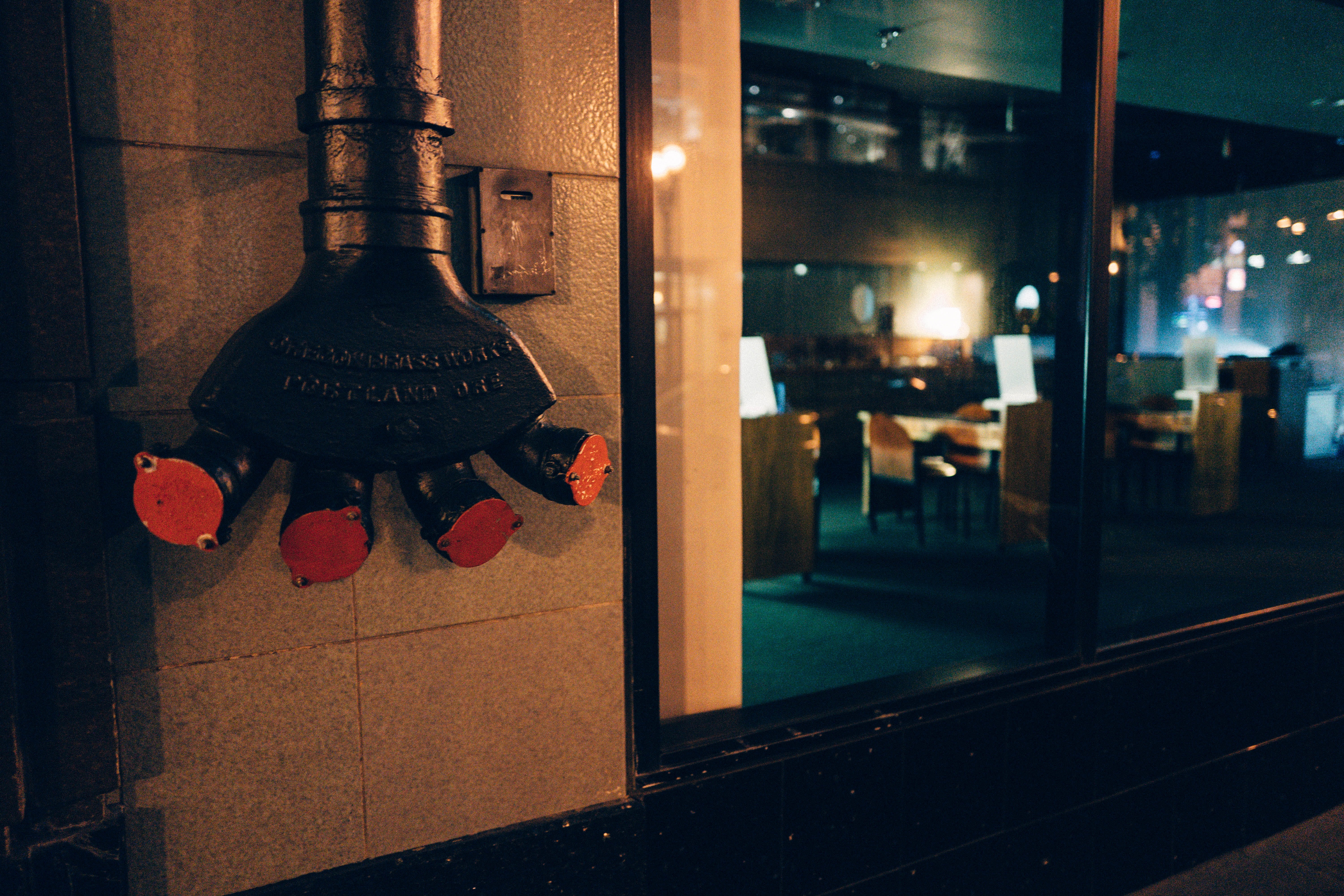 This photograph captures a striking juxtaposition of a vintage fire hydrant fixture against the backdrop of a dimly lit interior. The warm lighting from the inside contrasts with the cool, muted tones of the outside, creating an intriguing sense of depth and mystery. The composition subtly guides the viewer’s eye from the industrial subject to the inviting ambiance beyond the glass windows.