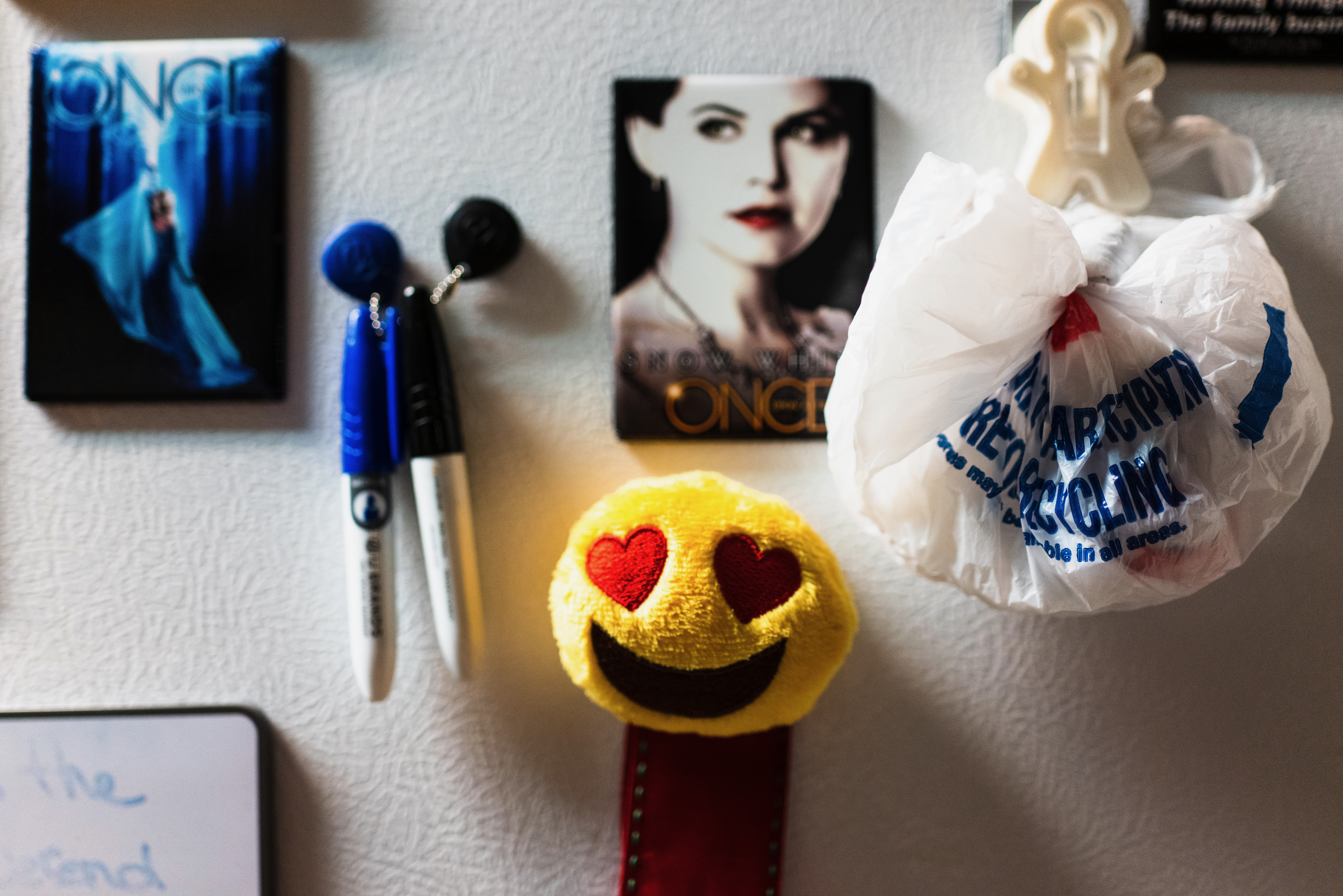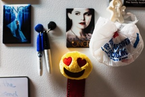 This photograph features a vibrant collage of everyday items attached to a refrigerator, showcasing a cheerful, cozy atmosphere. The playful emoji with heart-shaped eyes stands out against darker images from a TV show, creating a juxtaposition of joy and nostalgia. Soft, natural light illuminates the scene, enhancing the textures and colors, inviting the viewer into a personal space filled with memories and charm.