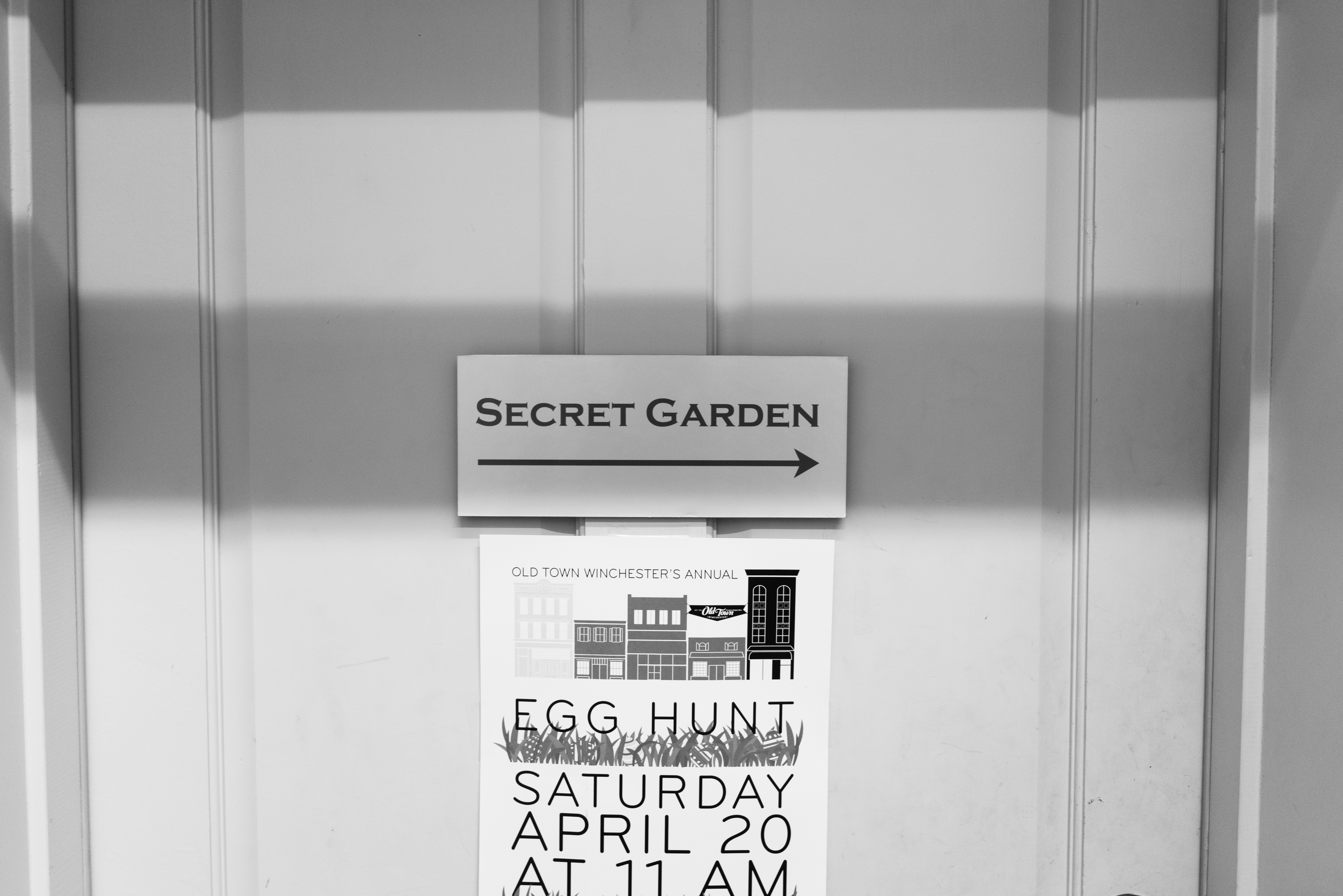 This photograph captures a quaint sign directing visitors to a 'Secret Garden,' evoking a sense of mystery and curiosity. The stark black-and-white contrast enhances the simplicity of the composition, while the soft shadows play across the textured surface, creating a moody atmosphere. Below, a flyer for an egg hunt adds a touch of community spirit, contrasting yet complementing the serene allure of the garden's invitation.