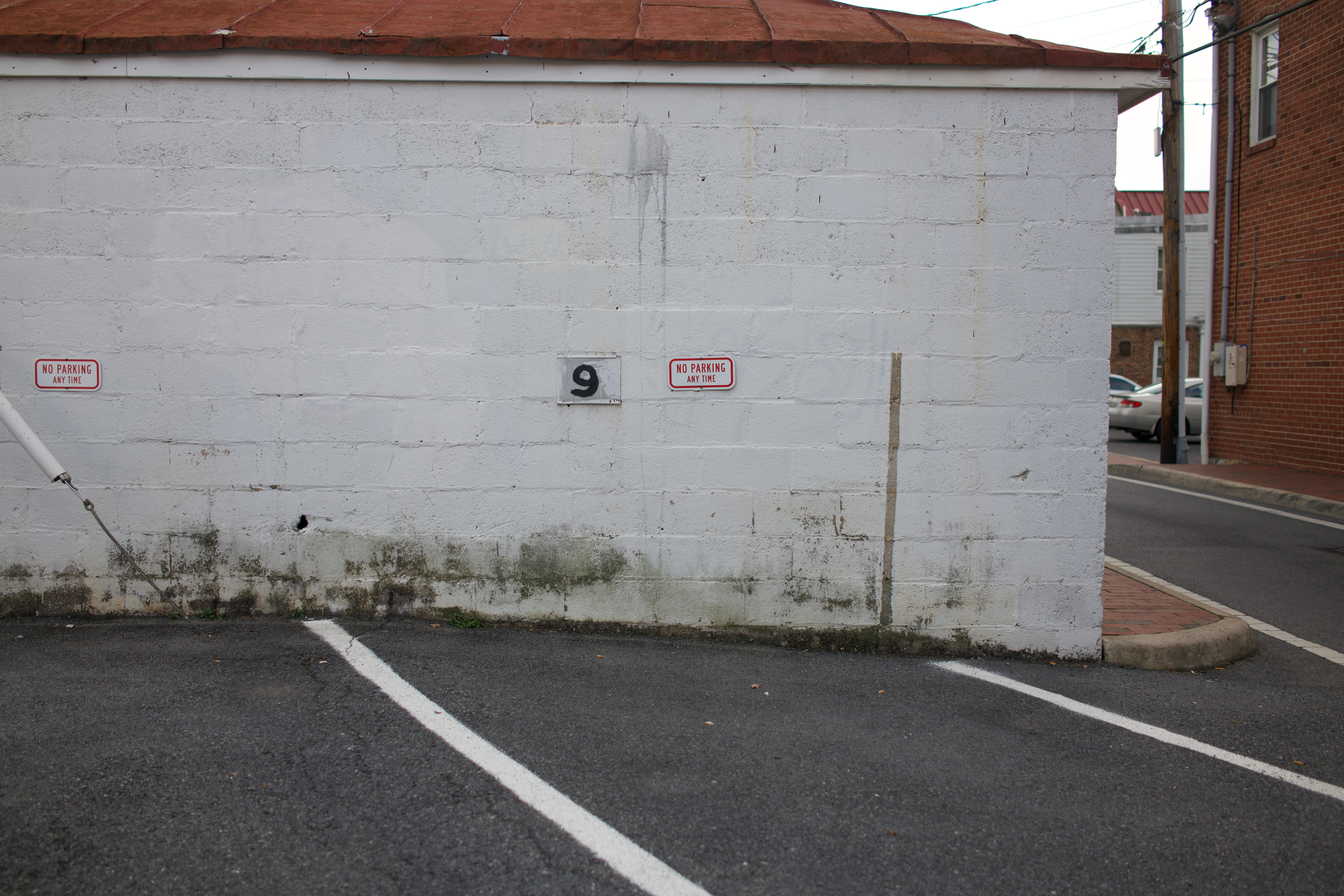 The photograph captures a stark, unadorned wall, marked by signs that prohibit parking, creating a sense of urban disconnection. The muted colors and subtle stains give a hint of neglect or age, evoking a melancholic atmosphere. Soft, diffused lighting enhances the texture of the wall and the emptiness of the surrounding space, inviting a moment of contemplation.