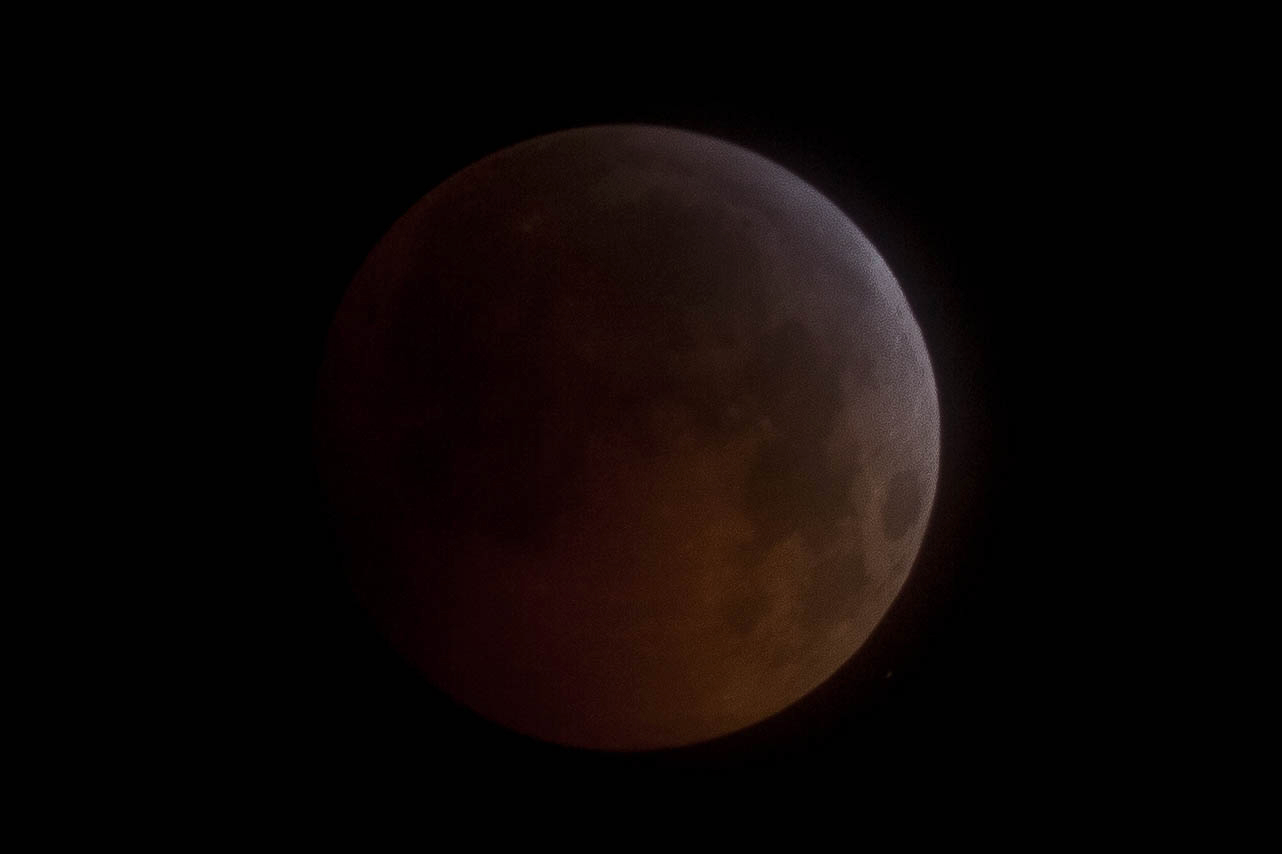 The photograph captures the moon during a lunar eclipse, enveloped in a deep, rich red hue against a pitch-black backdrop. The image conveys a sense of mystery and solitude, enhanced by the sharp contrast between the illuminated surface and the surrounding darkness. The composition centers the moon, drawing the viewer's attention to its textured cratered surface, evoking wonder at the celestial phenomenon.