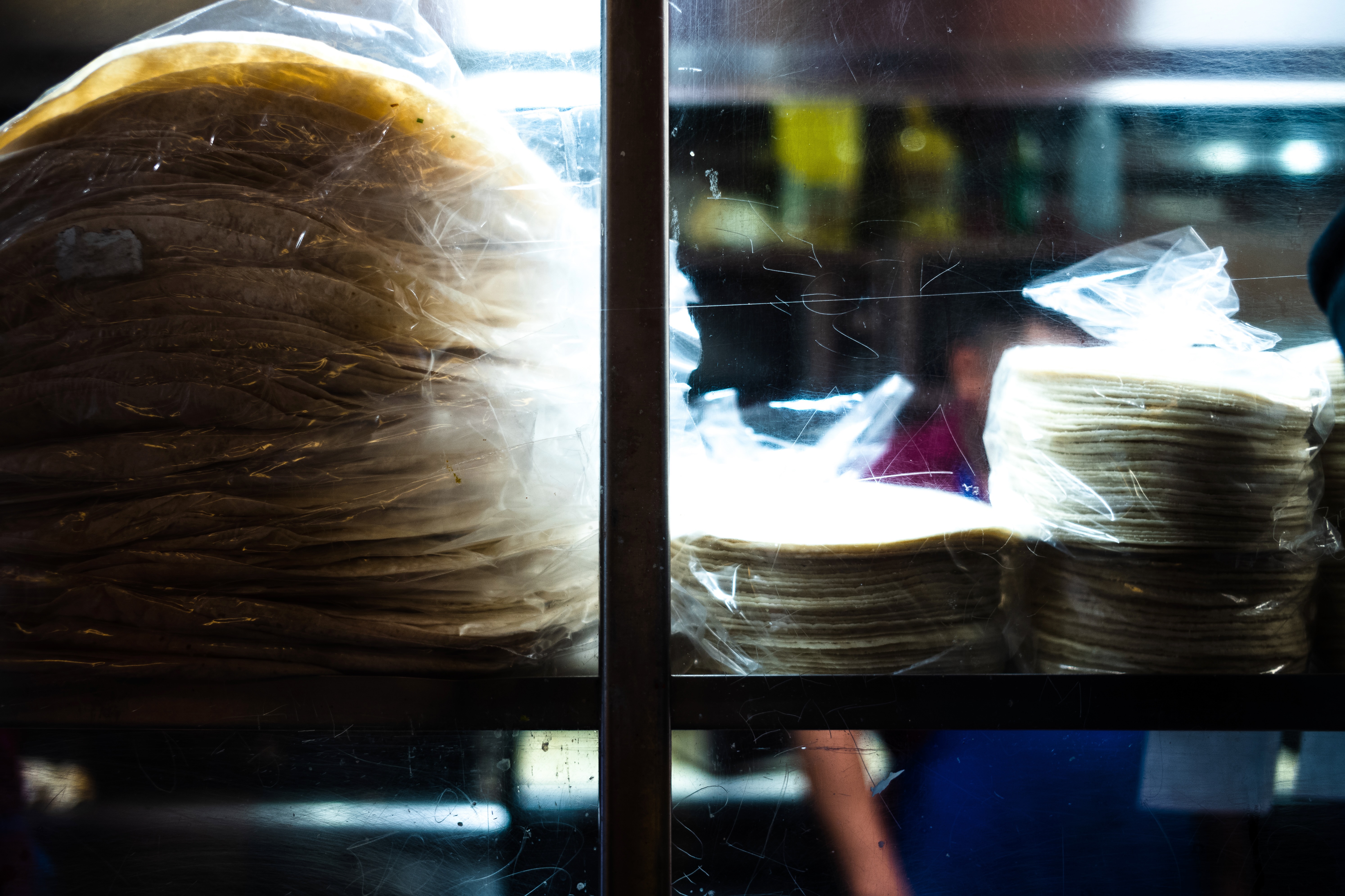 This photograph captures stacked tortillas behind glass, illuminated by soft, diffused light, creating a warm and inviting atmosphere. The gentle reflections and scratches on the glass add a textured depth, while the blurred figures in the background suggest a bustling culinary environment. The composition emphasizes abundance and the simplicity of daily life, inviting viewers to appreciate the humble yet vital role of food in culture.