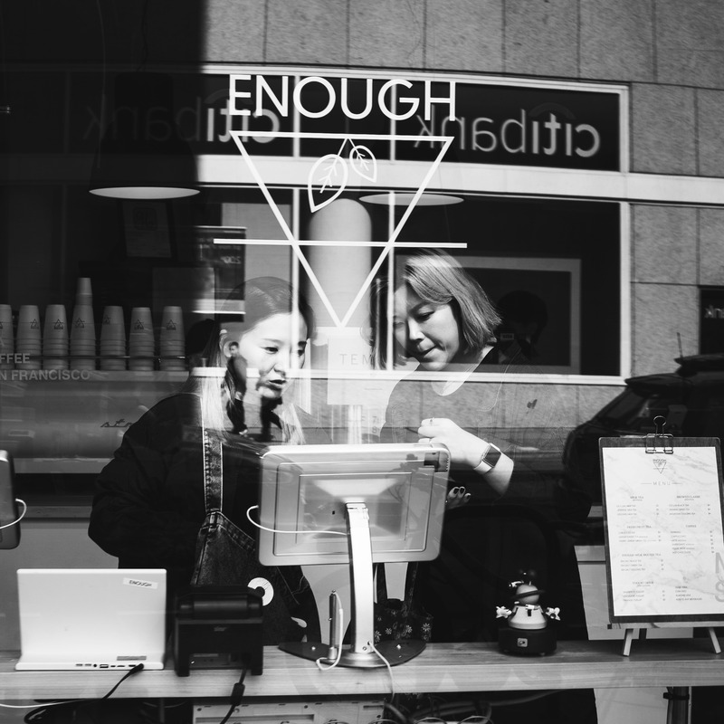 In this black-and-white photograph, two women engage intently at a café counter, their expressions illuminated by soft, natural light. The window's reflective surface adds layers to the composition, merging the interior with the outside world and creating a sense of intimacy in a bustling environment. The stark contrast and clear details evoke a mood of focus and warmth amidst the urban backdrop.