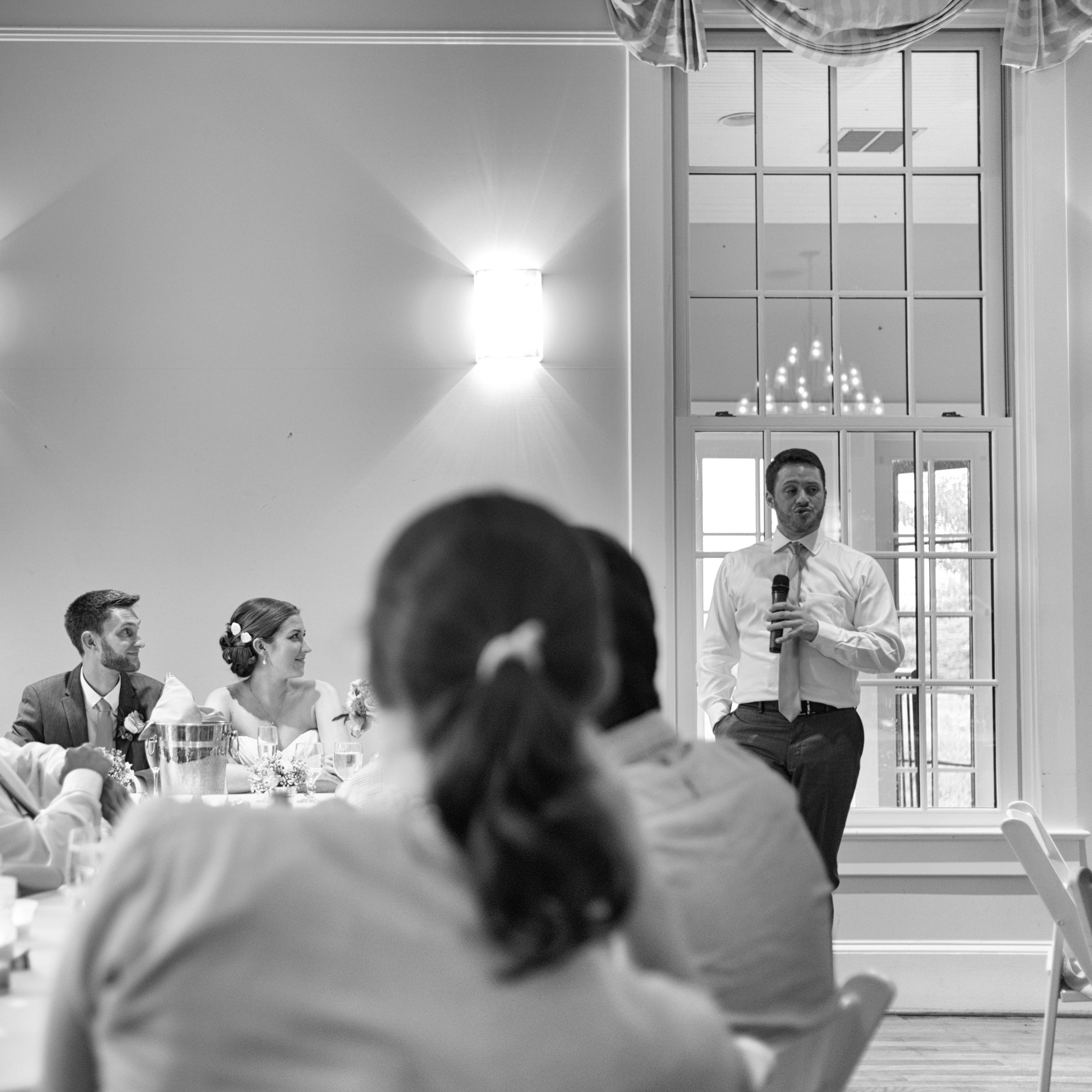 In a beautifully lit room, a speaker stands confidently with a microphone, delivering a heartfelt toast, while the engaged couple listens intently. The soft, warm lighting accentuates the joyous yet intimate atmosphere, capturing a moment of togetherness among family and friends. The composition draws the viewer's eye from the speaker to the couple, reflecting a blend of celebration and emotion.